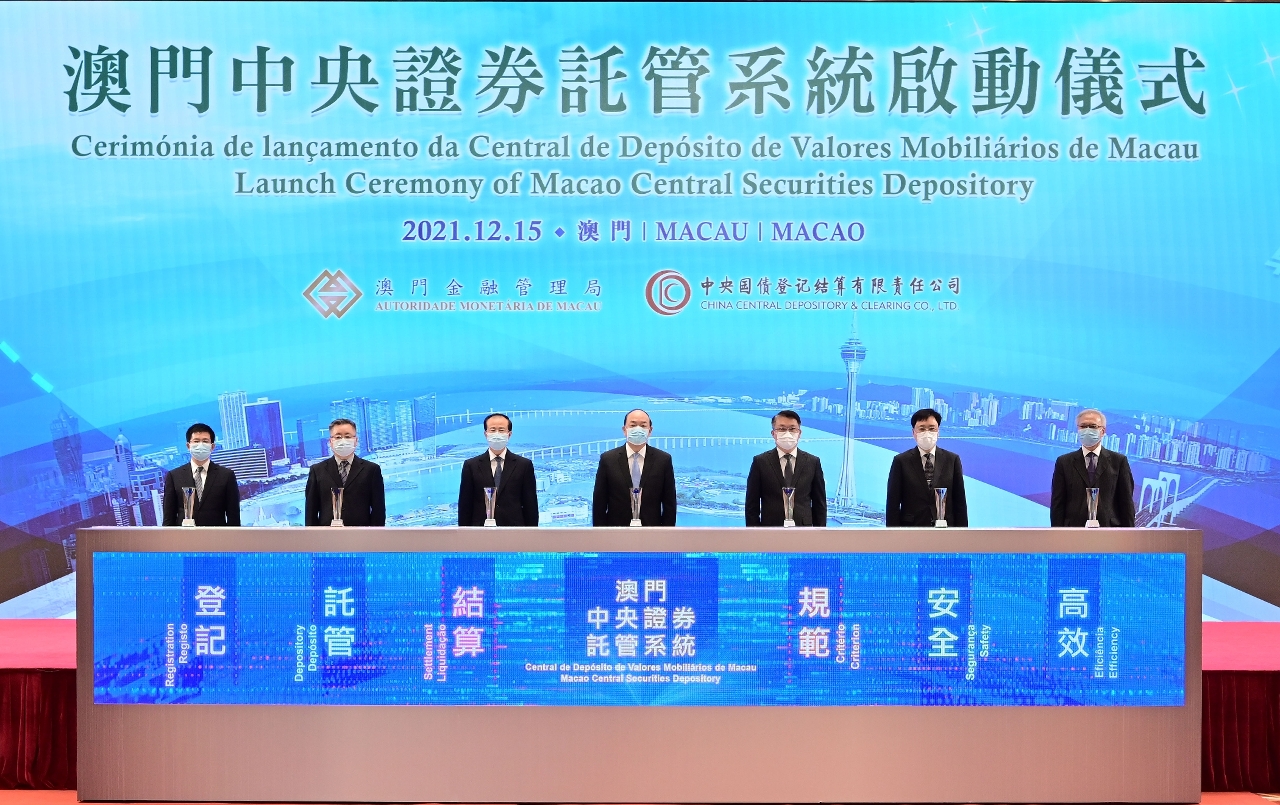A “Central de Depósito de Valores Mobiliários de Macau” (CSD) foi lançada oficialmente hoje (dia 15), tendo a Autoridade Monetária de Macau e a “China Central Depository & Clearing Co., Ltd.” (CCDC) organizado conjuntamente a cerimónia de lançamento que foi presidida pelo Chefe do Executivo, Dr. Ho Iat Seng e outros convidados. No mesmo dia, foram realizados o registo e o depósito de duas obrigações junto da “Central de Depósito e Liquidação de Valores Mobiliários de Macau Sociedade Unipessoal Limitada”.