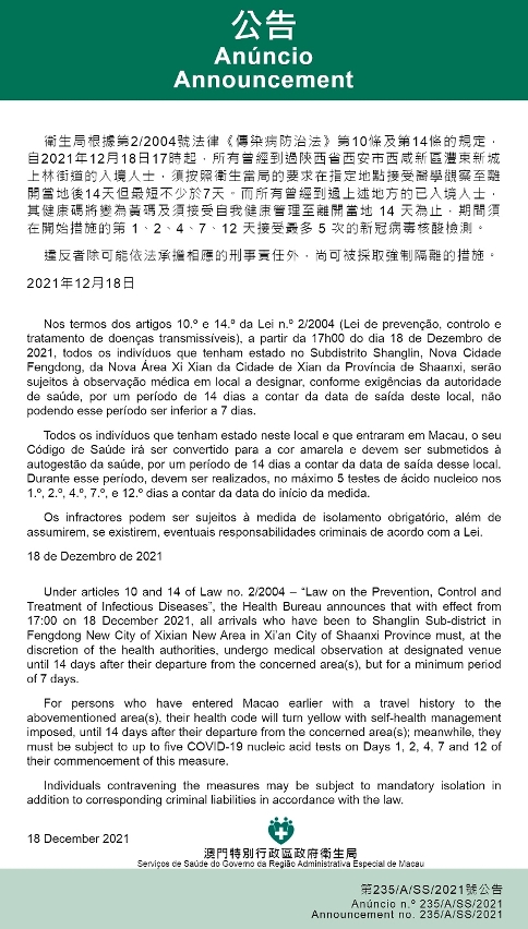 O Centro de Coordenação de Contingência do Novo Tipo de Coronavírus informa que tendo em consideração a evolução epidemiológica mais actualizada na Província de Shaanxi, a partir das 17h00 do dia 18 de Dezembro de 2021, todos os indivíduos que tenham estado no Subdistrito Shanglin, Nova Cidade Fengdong, da Nova Área Xi Xian da Cidade de Xian da Província de Shaanxi, serão sujeitos à observação médica em local a designar, conforme exigências da autoridade de saúde, por um período de 14 dias a contar da data de saída deste local, não podendo esse período ser inferior a 7 dias.