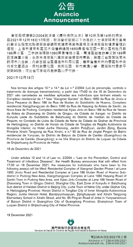 Simultaneamente, a partir das 17h00 do dia 18 de Dezembro de 2021, são canceladas as medidas aplicadas aos indivíduos que tenham estado no Complexo residencial da 1.ª fase “Xiangmei Garden” do Beco 1650 da Rua de Jinxiu e Zona Pequena do Beco 186 da Rua de Mudan do Subdistrito de Huamu, Complexo residencial Xiangzhangyuan do Beco 1080 da Rua de Haiyang da Aldeia de Sanlin, da Nova Área de Pudong, Complexo residencial Xijiao Jinlu do Beco 189 da Rua de Yewen da Aldeia de Zhaoxiang do Distrito de Qingpu, da Cidade de Xangai; no Distrito de Kunyufu Leste do Subdistrito de Balizhuang do Distrito de Haidian da Cidade de Pequim; no Condado de Liuhe da Cidade de Nehe da Cidade de Qiqihar da Província de Heilongjiang; no Distrito de Horqin da Cidade de Tongliao da Região Autónoma da Mongólia Interior; no Hotel Junhe Wenxing,  Jardim PolyZiyun, Jardim Zijing, Escola Primária Xinshi Tangyong da Rua Xinshi, e n.º 95 da Rua de Jingtai Pingan do Bairro residencial de Yunyuan, do Distrito de Baiyun da Cidade de Cantão (Guangzhou) da Província de Cantão (Guangdong); e na Vila Shanyin do Distrito de Luquan da Cidade de Shijiazhuang da Província de Hebei.