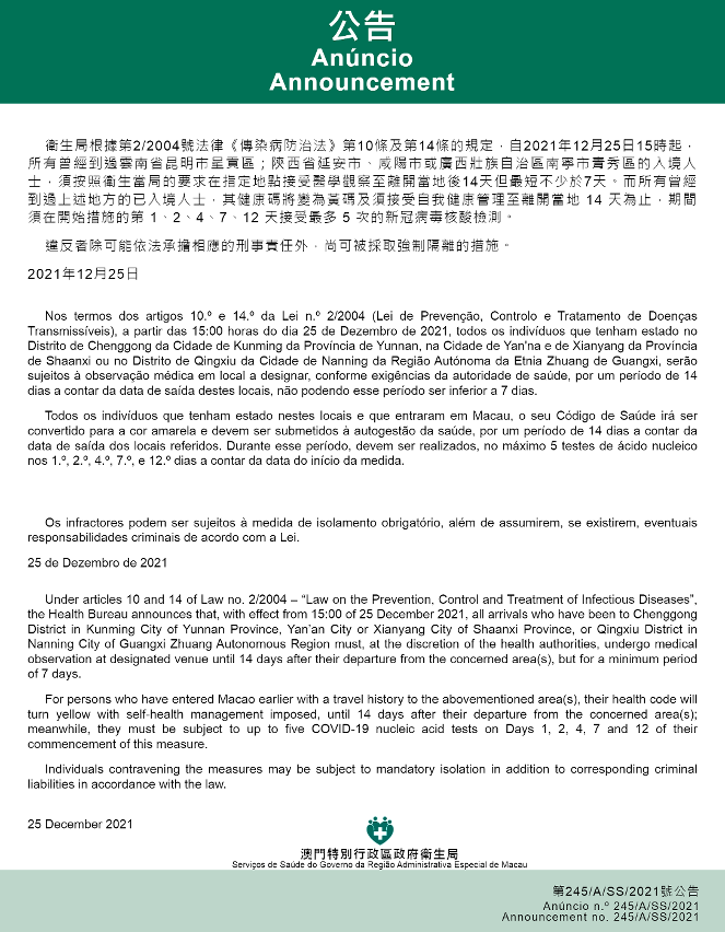 O Centro de Coordenação de Contingência do Novo Tipo de Coronavírus informa que tendo em consideração a evolução epidemiológica mais actualizada na Província de Yunnan, na Província de Shaanxi e na Região Autónoma da Etnia Zhuang de Guangxi, a partir das 15h00 do dia 25 de Dezembro de 2021, todos os indivíduos que tenham estado no Distrito de Chenggong da Cidade de Kunming da Província de Yunnan, na Cidade de Yan'na e de Xianyang da Província de Shaanxi ou no Distrito de Qingxiu da Cidade de Nanning da Região Autónoma da Etnia Zhuang de Guangxi, serão sujeitos à observação médica em local a designar, conforme exigências da autoridade de saúde, por um período de 14 dias a contar da data de saída destes locais, não podendo esse período ser inferior a 7 dias.