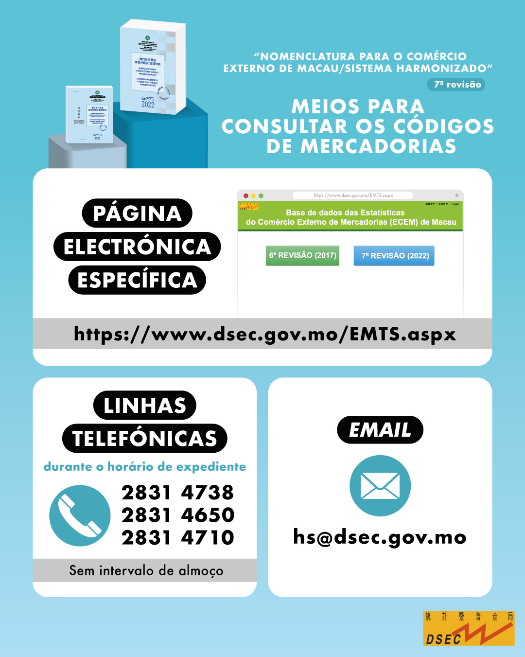 - Consulta por e-mail: caso surjam dificuldades na pesquisa dos códigos de mercadorias, pode enviar um e-mail para hs@dsec.gov.mo;