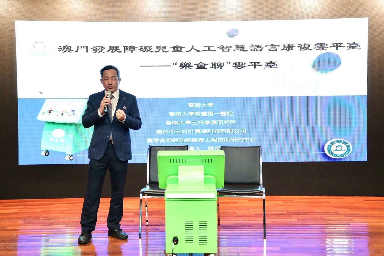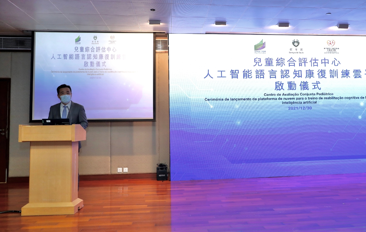 A cerimónia de lançamento da plataforma de nuvem para o treino de reabilitação cognitiva de linguagem de inteligência artificial realiza-se hoje (dia 30) no Centro de Saúde da Areia Preta, organizada conjuntamente pelos Serviços de Saúde, Direcção dos Serviços de Educação e de Desenvolvimento da Juventude, Instituto de Acção Social e Rede de cuidados para crianças com dificuldades de desenvolvimento. Os convidados desta cerimónia de lançamento incluíram o Director dos Serviços de Saúde, Dr. Lo Iek Long, o Director do Centro Hospitalar Conde de São Januário, Dr. Kuok Cheong U, o Vice-Presidente do Instituto de Acção Social, Dr. Tang Yuk Wa, o Chefe do Departamento do Ensino Não Superior da Direcção dos Serviços de Educação e de Desenvolvimento da Juventude, Dr. Wong Ka Ki, o Director do Departamento de Medicina da Universidade de Jinan, Professor Minghao Liang, o Director do Departamento de reabilitação do primeiro hospital afiliado da Universidade de Jinan, Professor Zhuoming Chen e o Coordenador do Grupo de Trabalho Interdepartamental de Intervenção Precoce, Dr. Tai Wa Hou e eles presidiram conjuntamente a cerimónia de lançamento.