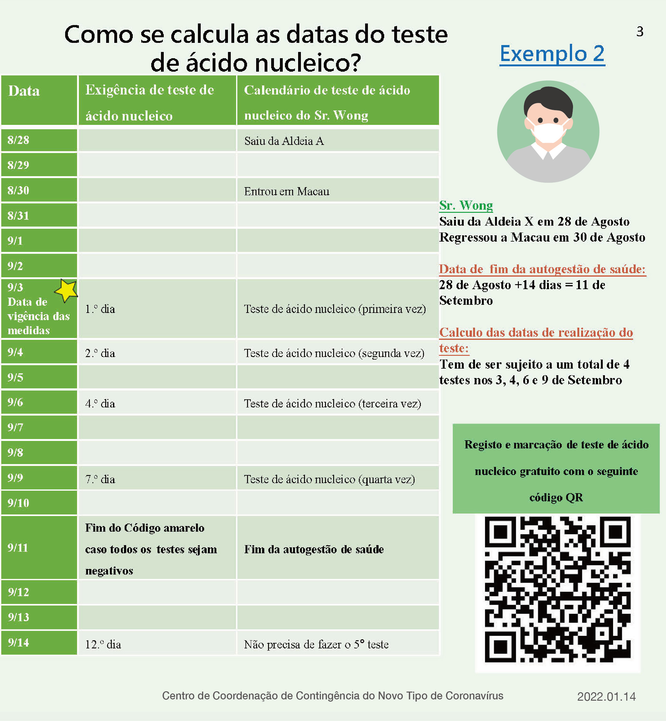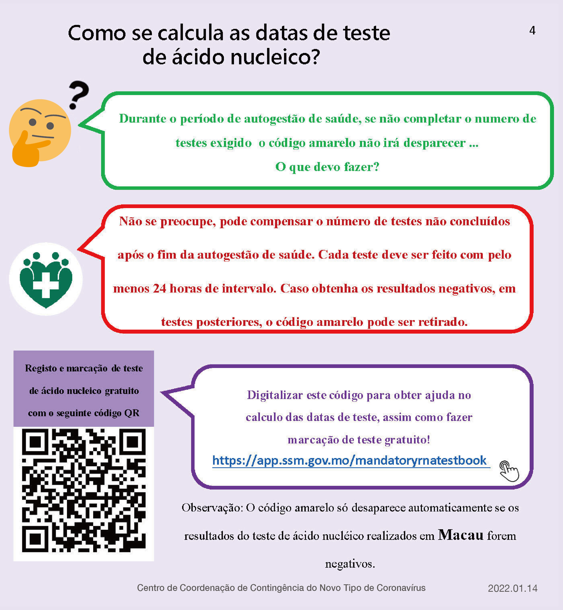 - Datas de realização de teste de ácido nucleico: A partir da data de vigência das medidas, precisa de ser sujeito até a 5 testes de ácido nucleico de novo tipo de coronavírus nos 1.º, 2.º, 4.º, 7.º e 12.º dias do período de autogestão da saúde, ou seja, as medidas entraram em vigor em 14 de Janeiro, um total de 5 testes de ácido nucleico serão realizados nos dias 14, 15, 17, 20 e 25 de Janeiro. No caso de saída do local relevante no dia 1 de Janeiro, a autogestão da saúde será realizada até 15 de Janeiro, ou seja, apenas um total de 2 testes de ácido nucleico devem ser realizados nos dias 14 e 15 de Janeiro.