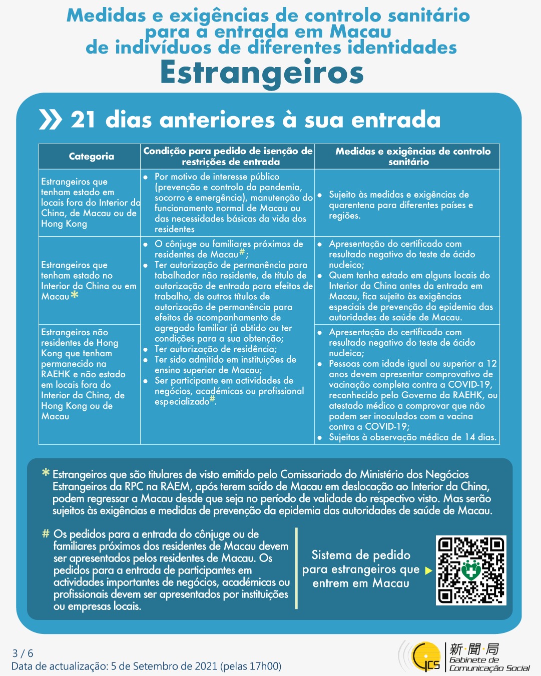 Medidas e exigências de controlo sanitário para a entrada em Macau de indivíduos de diferentes identidades.