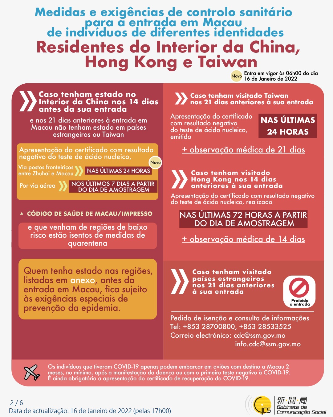 (Infografia)Medidas e exigências de controlo sanitário para a entrada em Macau de indivíduos de diferentes identidades, actualizadas no dia 22 de Janeiro de 2022