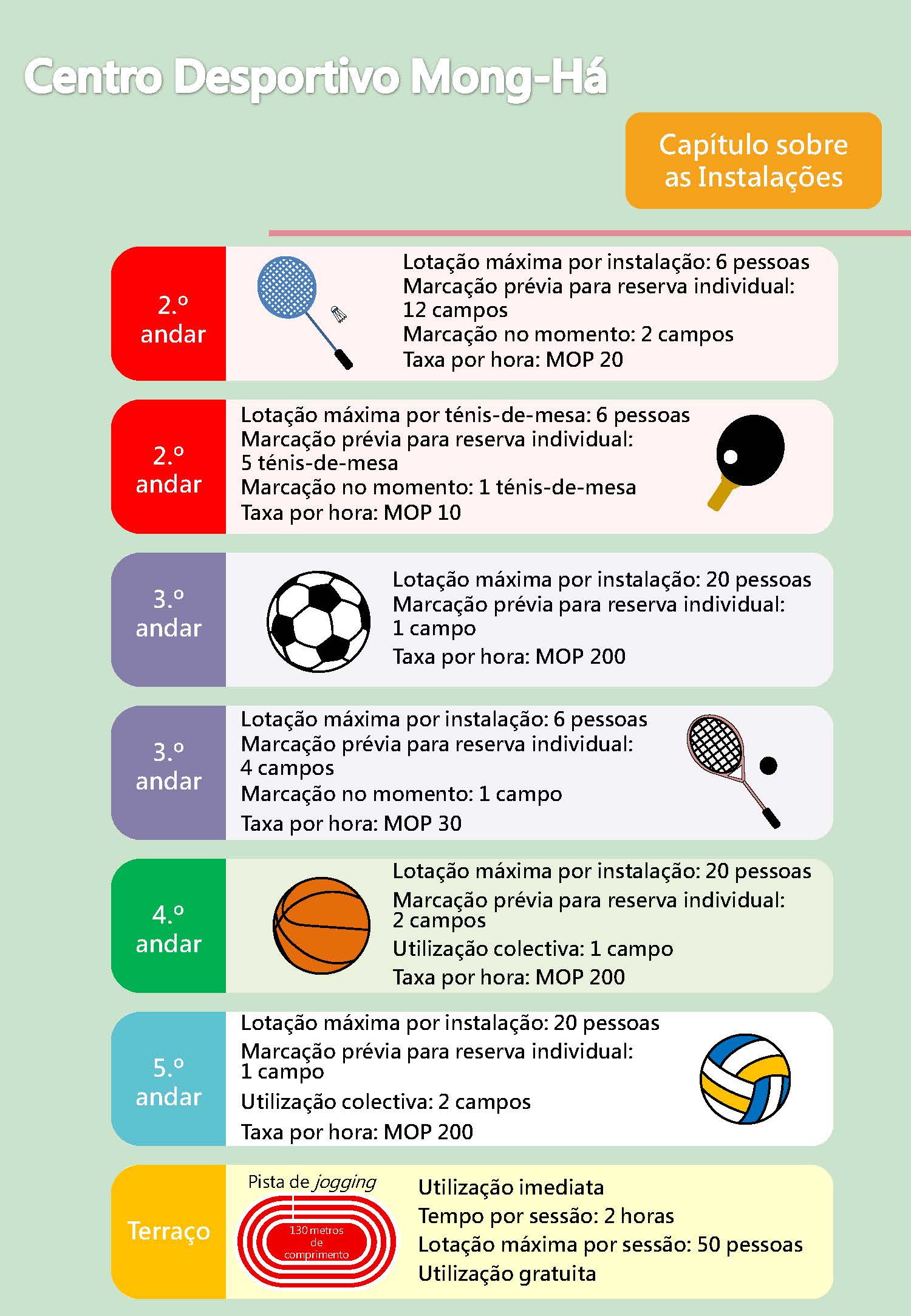 O Centro Desportivo Mong-Há tem 5 andares, diferentes instalações desportivas estão localizadas em diferentes andares e são principalmente as modalidades desportivas mais procuradas pelo público, tendo em vista proporcionar aos residentes espaços para a prática de diferentes desportos e promover o estilo de vida saudável através da prática desportiva ao longo da vida junto da população em geral. Para facilitar os residentes a melhor organizarem os seus planos de prática de exercícios físicos, a utilização das instalações desportivas do Centro é efectuada essencialmente através da compra de bilhetes por via electrónica. Por outro lado, para efeitos de prevenção da pandemia, o Centro vai restringir o número de pessoas que terá acesso às instalações desportivas, por forma a evitar a grande aglomeração de pessoas, pelo que, se solicitam aos residentes a efectuarem as marcações com a maior brevidade possível. Após a marcação com sucesso das instalações desportivas do Centro, ao utente que comprou o bilhete é emitido o recibo da compra do bilhete com dois códigos QR, devendo o qual aceder ao andar correspondente 30 minutos antes do início da hora de utilização indicado em um dos códigos QR “entrar e sair da instalação desportiva” e efectuar pessoalmente o registo 15 minutos antes do início da hora de utilização através da apresentação do segundo código QR “utilização da instalação desportiva” e do documento de identificação registado no recibo para efeitos de verificação pelo pessoal em serviço no Centro. Findos os procedimentos atrás mencionados, o utente que comprou o bilhete e os demais utentes podem aceder à instalação desportiva através da apresentação do código QR “entrar e sair da instalação desportiva” (cópia ou gravação da imagem).