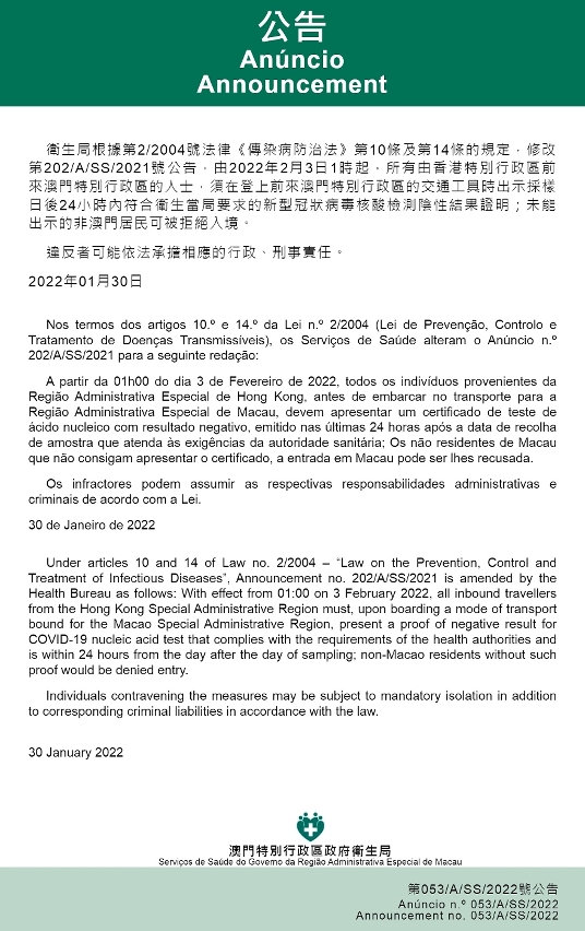 A partir da 01h00 do dia 3 de Fevereiro de 2022, todos os indivíduos provenientes da Região Administrativa Especial de Hong Kong, antes de embarcar no transporte para a Região Administrativa Especial de Macau, devem apresentar um certificado de teste de ácido nucleico com resultado negativo, emitido nas últimas 24 horas após a data de recolha de amostra que atenda às exigências da autoridade sanitária; Os não residentes de Macau que não consigam apresentar o certificado, a entrada em Macau pode ser-lhes recusada.
