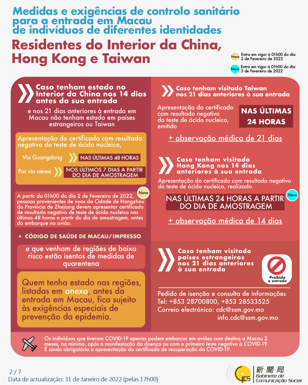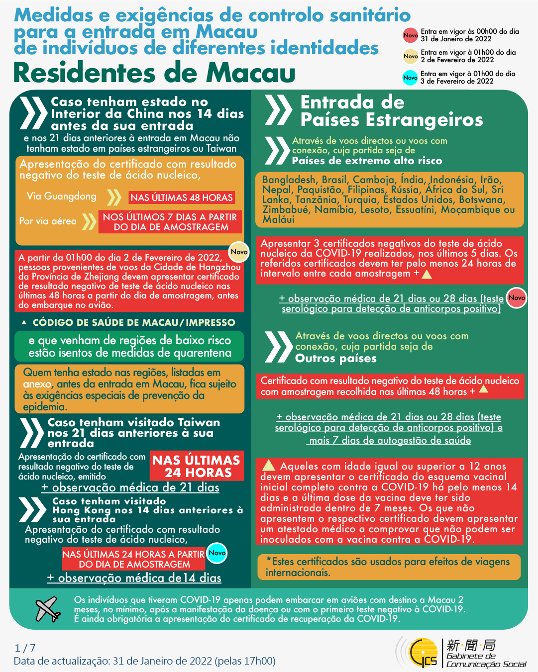 (Infografia)Medidas e exigências de controlo sanitário para a entrada em Macau de indivíduos de diferentes identidades, actualizadas no dia 31 de Janeiro de 2022