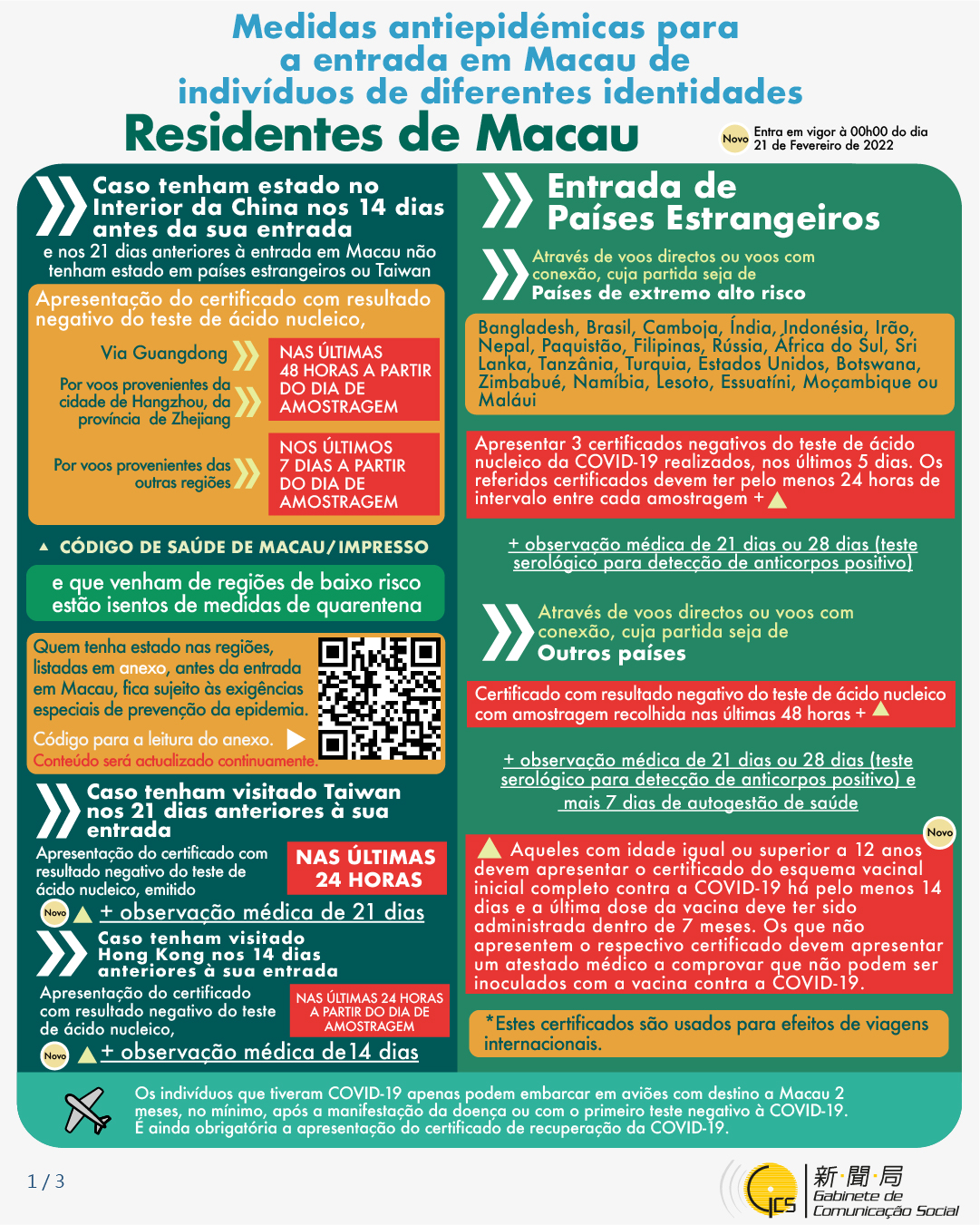 (Infografia)Medidas antiepidémicas para a entrada em Macau de indivíduos de diferentes identidades, actualizadas no dia 16 de Fevereiro de 2022