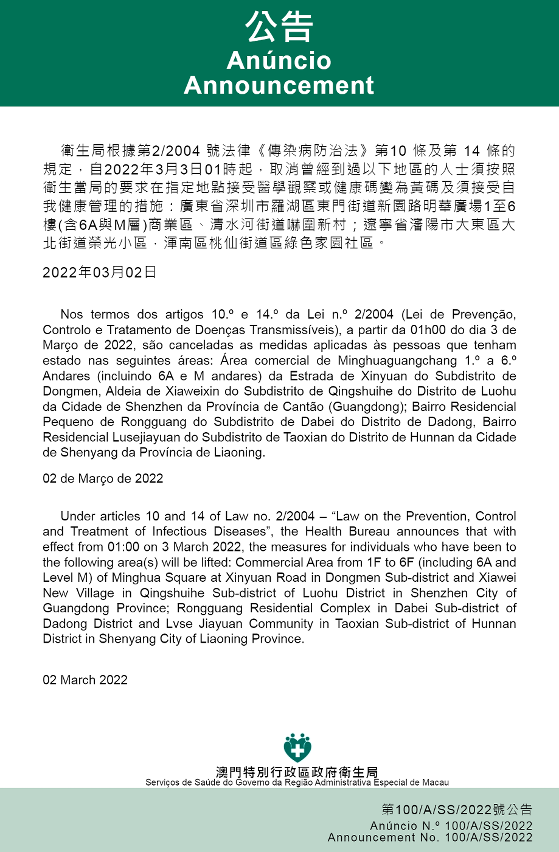Outras áreas do Distrito de Baoan (excluindo os indivíduos que passam pelo Distrito de Baoan para ida e volta do aeroporto ou terminal de passageiros) |
