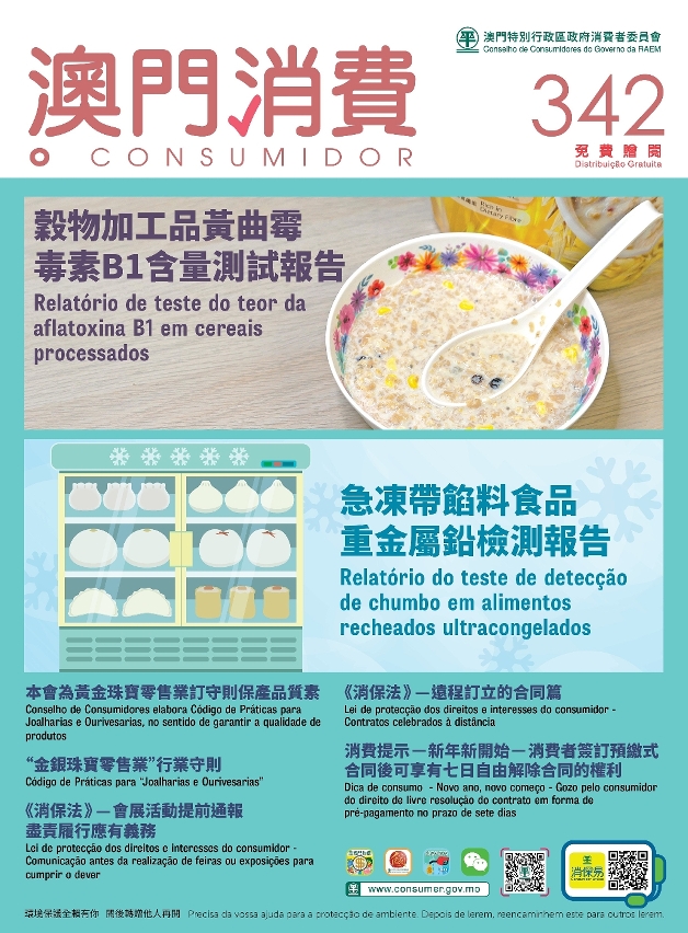 No boletim “O Consumidor” n.º 342, editado pelo Conselho de Consumidores (CC), foram publicados os resultados do teste do teor de aflatoxina B1 em cereais processados e do teste de detecção de chumbo em alimentos recheados ultracongelados, que reflectiram todas as amostras recolhidas aprovadas. A nova edição do “O Consumidor” continua a apresentar, nos textos temáticos, a Lei n.º 9/2021 (Lei de protecção dos direitos e interesses do consumidor).