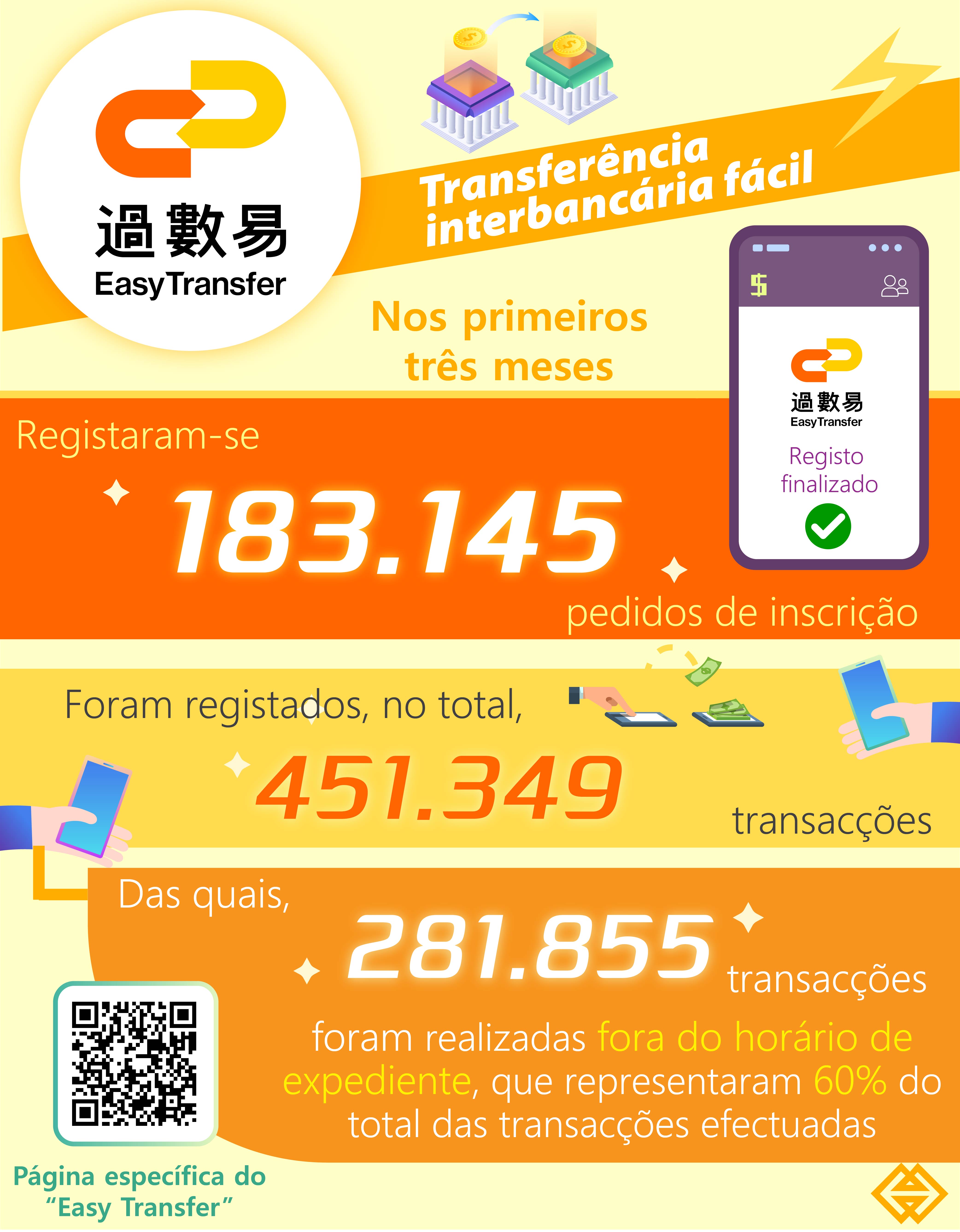 Em Macau, há 31 bancos que prestam os serviços de transferência rápida local interbancária de fundos de pequeno montante, denominados por “Easy Transfer”, onze dos quais podem facultar serviços de transferência interbancária em tempo real, todos os dias, durante 24 horas (7x24), podendo a transacção dar-se por concluída em cerca de 30 segundos. Desde o lançamento dos serviços “Easy Transfer”, foram realizadas, nos primeiros três meses, mais de 183.000 inscrições e de 451.000 transacções, das quais mais de 9.000 foram transacções interbancárias relativas a vencimentos ou salários. Verifica-se, por outro lado, que mais de 60% das transacções foram realizadas fora do horário normal de serviço, tendo-se alcançado o objectivo no que respeita à prestação de serviços mais eficientes e mais convenientes.