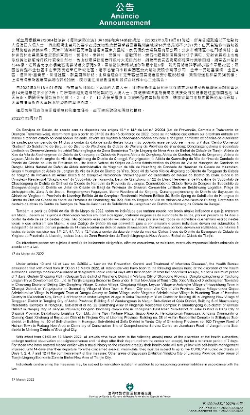 Tendo em consideração a evolução epidemiológica mais actualizada no Interior das China, os Serviços de Saúde, de acordo com os dispostos nos artigos 10.º e 14.º da Lei n.º 2/2004 (Lei de Prevenção, Controlo e Tratamento de Doenças Transmissíveis), determinam que a partir da 01h00 do dia 18 de Março de 2022, todos os indivíduos que entrem ou já tenham entrado em Macau e tenham estado nos locais abaixo indicados, devem ser sujeitos à observação médica em local a designar, conforme exigências da autoridade de saúde, por um período de 14 dias a contar da data de saída destes locais, não podendo esse período ser inferior a 7 dias: Centro Comercial “Gudejin” do Subdistrito de Beiguan do Distrito de Weicheng da Cidade de Weifang da Província de Shandong; Dongfangxingcheng e Sociedade Limitada do Desenvolvimento Industrial Taizhanglingjun da Zona Económica Tianjin Lingang da Nova Área de Binhai da Cidade de Tianjin; Aldeia de Xiao da Vila de Xiaohongmen do Distrito de Chaoyang da Cidade de Pequim; Aldeia de Dongfeng, Aldeia de Qiaotun, Aldeia de Qingxiang, Aldeia de Leyuan, Aldeia de Aolonghe da Vila de Huapichang do Distrito de Changyi, Yangzigoutun da Aldeia de Gunmaling da Vila de Yima do Condado de Panshi da Cidade de Jilin da Província de Jilin; Aldeia Natural de Qiqiao da Aldeia Administrativa de Qiqiao da Vila de Huangchi do Condado de Dangtu, Aldeia Natural de Dafan da Aldeia Administrativa de Yingchun da Vila de Huanfeng do Condado de Hanshan da Cidade de Maanshan, Grupo 4 Huangdun da Aldeia de Longtan da Vila de Xuba do Distrito de Yi'na, Bloco 46 da Nova Vila de Jingxiang do Distrito de Tongguan da Cidade de Tongling da Província de Anhui; Bloco 5 do Complexo Residencial “Wenkangyuan” do Subdistrito de Maqun do Distrito de Qixia, Bloco 6 do Complexo Residencial “Shazhuxiang” do Subdistrito de Hongwulu, Beco de Qianzhang n.º 22 do Bairro Residencial de Pingshijie do Subdistrito de Chaotiangong do Distrito de Qinhuai da Cidade de Nanquim da Província de Jiangsu; Comunidade da Cidade Nova de Dongren do Subdistrito de Zhongshandonglu do Distrito de Jintai da Cidade de Baoji da Província de Shaanxi; Companhia Limitada de Beidahuang Logística, Praça de Jinheyipincaifu, Zona A de Jinzuo, Hengxiangwan Fuguiyuan, Bairro Residencial de Xingang, Qunxingguojixincheng do Distrito de Bayuquan da Cidade de Yingkou da Província de Liaoning; Edifício 38 do Complexo Residencial Hui'nam Edifício 50, Berlin Spring do Subdistrito de Huangwu do Distrito de Zhifu da Cidade de Yantai da Província de Shandong; No. 920, Rua de Tingyue da Vila de Huinan da Área Nova de Pudong, Dormitório do canteiro de obras do Centro de Serviços da Rua de Jianchuan do Subdistrito de Jiangchuan do Distrito de Minhang da Cidade de Xangai.