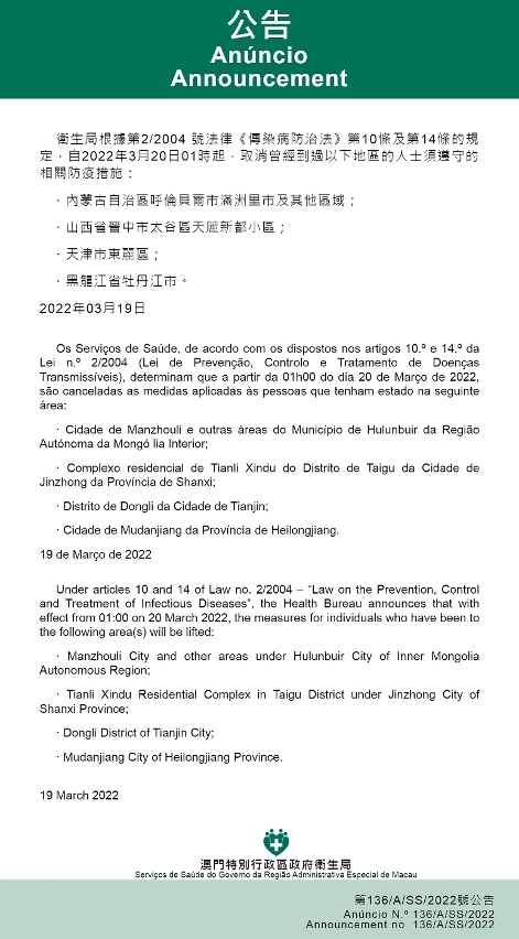 Anuncia-se, ainda, que a partir da 01h00 do dia 20 de Março de 2022, foram canceladas as medidas aplicadas às pessoas que tenham estado nas seguintes áreas e devem ser sujeitos à observação médica em local a designar, conforme exigências da autoridade de saúde ou o seu Código de Saúde irá ser convertido para a cor amarela e devem ser submetidos à autogestão da saúde: Cidade de Manzhouli e outras áreasdo Município de Hulunbuir da Região Autónoma da Mongó lia Interior; Complexo residencial de Tianli Xindu do Distrito de Taigu da Cidade de Jinzhong da Província de Shanxi;Distrito de Dongli da Cidade de Tianjin;Cidade de Mudanjiang da Província de Heilongjiang;