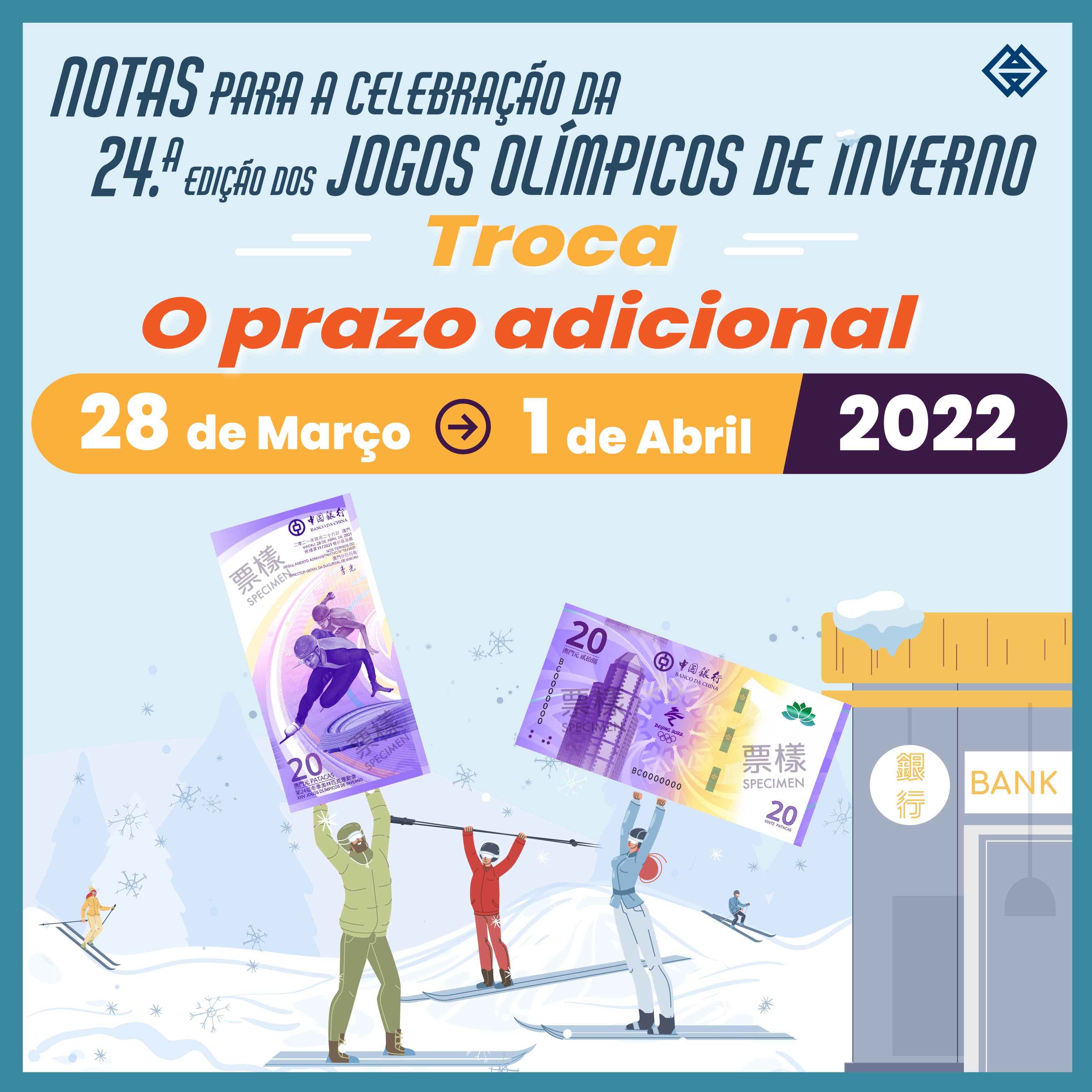 Segundo os procedimentos anteriormente estabelecidos, o prazo para troca das notas para a celebração da 24ª Edição dos Jogos Olímpicos de Inverno terminará no dia 25 de Março de 2022 (Sexta-feira). Com vista a facilitar os residentes na troca das mesmas, a AMCM concede um prazo adicional para troca que decorrerá de 28 de Março de 2022 a 1 de Abril de 2022. Mais se informa que os residentes que procederam à subscrição “on-line” e que não efectuaram a troca, devem proceder à troca destas notas dentro do prazo adicional e dirigir-se ao local previamente escolhido para o efeito.