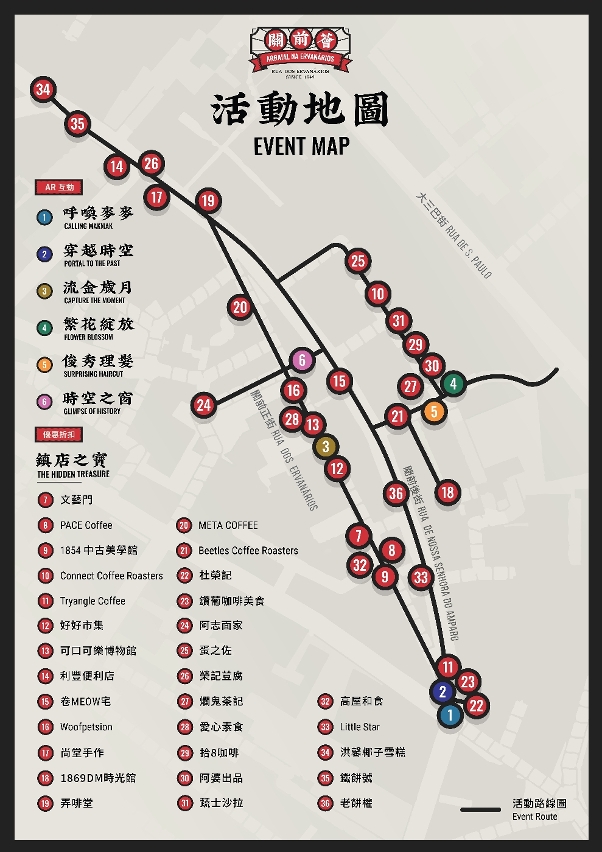 Logo depois de fazer leitura, por meio de telemóvel, do código QR exibido nas placas colocadas na zona, os visitantes podem experimentar os novos jogos com tecnologia de RA, ou seja, podem no jogo do “Chamando Makmak”, fazer interacção e tirar fotografia com Makmak; no jogo “Janela para viagem no tempo”, viajar no tempo para dar uma olhada na antiga Rua dos Ervanários; bem como experimentar os serviços de cabeleireiro através da tecnologia de RA e fazer check-in e tirar fotografia no jogo “Cabeleireiro mágico”, enriquecendo deste modo a experiência de excursão pela Rua de Ervanários. Além disso, o evento conta com a oferta de lembranças com interacção de RA chamada “Oferta de lembranças”, visando aumentar o efeito de promoção e divulgação destas actividades.