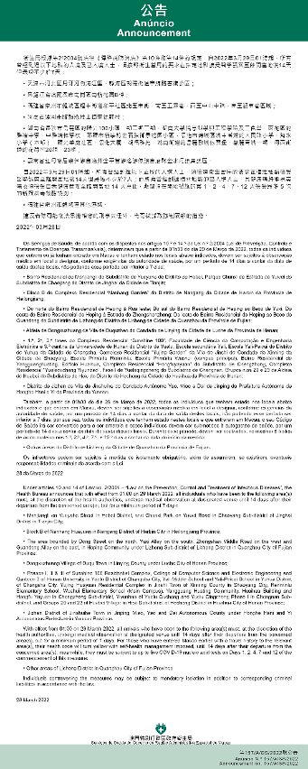 Tendo em consideração a evolução epidemiológica mais actualizada no Interior da China, os Serviços de Saúde, de acordo com os dispostos nos artigos 10.º e 14.º da Lei n.º 2/2004 (Lei de Prevenção, Controlo e Tratamento de Doenças Transmissíveis), determinam que a partir da 01h00 do dia 29 de Março de 2022, todos os indivíduos que entrem ou já tenham entrado em Macau e tenham estado nos locais abaixo indicados, devem ser sujeitos à observação médica em local a designar, conforme exigências da autoridade de saúde, por um período de 14 dias a contar da data de saída destes locais, não podendo esse período ser inferior a 7 dias: