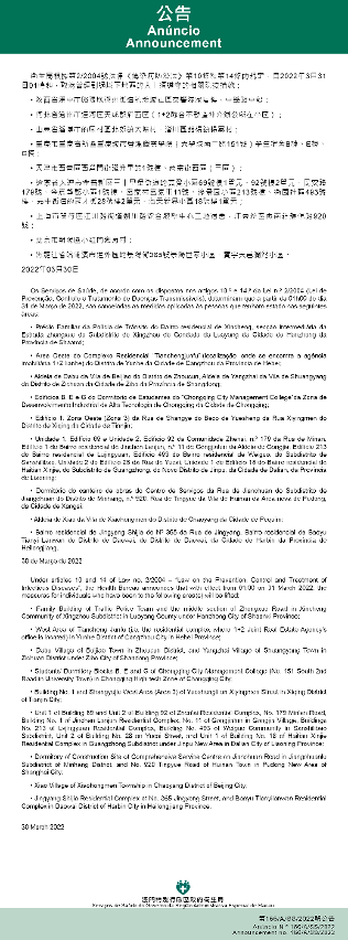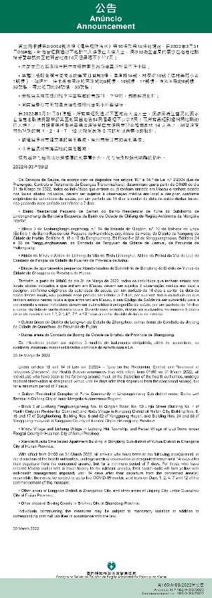 Tendo em consideração a evolução epidemiológica mais actualizada no Interior da China, os Serviços de Saúde, de acordo com os dispostos nos artigos 10.º e 14.º da Lei n.º 2/2004 (Lei de Prevenção, Controlo e Tratamento de Doenças Transmissíveis), determinam que a partir da 01h00 do dia 31 de Março de 2022, todos os indivíduos que entrem ou já tenham entrado em Macau e tenham estado nos locais abaixo indicados, devem ser sujeitos à observação médica em local a designar, conforme exigências da autoridade de saúde, por um período de 14 dias a contar da data de saída destes locais, não podendo esse período ser inferior a 7 dias: