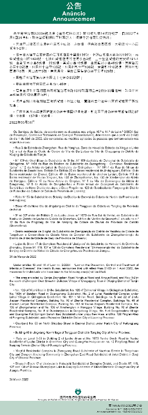Tendo em consideração a evolução epidemiológica mais actualizada no Interior da China, os Serviços de Saúde, de acordo com os dispostos nos artigos 10.º e 14.º da Lei n.º 2/2004 (Lei de Prevenção, Controlo e Tratamento de Doenças Transmissíveis), determinam que a partir da 01h00 do dia 1 de Abril de 2022, todos os indivíduos que entrem ou já tenham entrado em Macau e tenham estado nos locais abaixo indicados, devem ser sujeitos à observação médica em local a designar, conforme exigências da autoridade de saúde, por um período de 14 dias a contar da data de saída destes locais, não podendo esse período ser inferior a 7 dias: