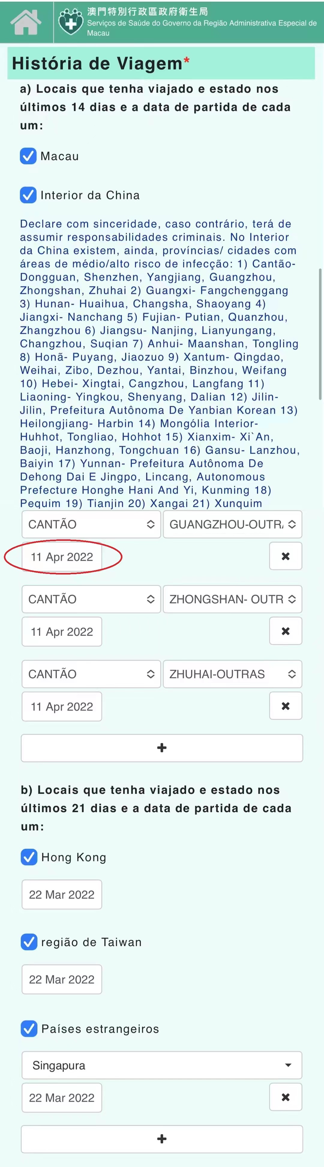 Até agora só era necessário assinalar no campo – História de Viagem – os locais onde tinha permanecido nos últimos 14 ou 21 dias, não existindo a necessidade de mencionar a data. Essa situação por ser simples, facialmente causava transtornos aos utilizadores