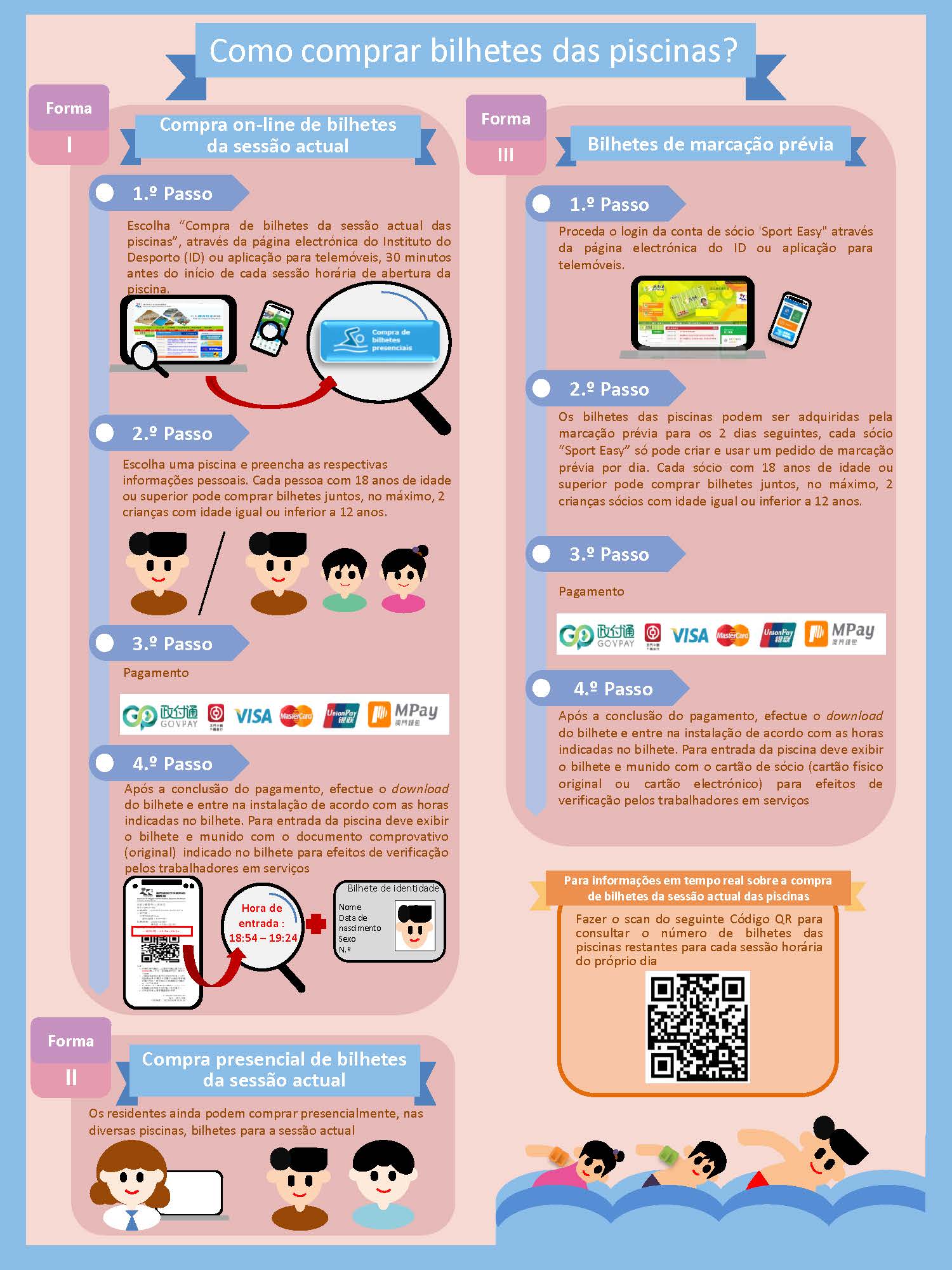 Em articulação com a Governação Electrónica da RAEM, a partir do dia 1 de Maio, o Instituto do Desporto irá adicionar o serviço de marcação online de bilhetes presenciais para as piscinas. Os bilhetes serão vendidos 30 minutos antes do horário de funcionamento de cada secção horária. Usando o bilhete de identidade ou o cartão de sócio “Sport Easy”, o interessado pode aceder à página electrónica do Instituto do Desporto www.sport.gov.mo ou entrar na aplicação de telemóvel, escolher “marcação prévia de instalação e compra de bilhetes” e depois escolher “Compra de bilhetes presenciais”; selecionar a piscina pretendida, preencher os dados pessoais e efectuar o pagamento electrónico. A população pode descarregar pessoalmente o bilhete e o Instituto do Desporto emite um código QR que remete ao interessado por mensagem de telemóvel. Além disso, as crianças com idade igual ou inferior a 12 anos, não podem aceder sozinhas às piscinas, devendo estar acompanhados por um adulto com idade igual ou superior a 18 anos. Cada adulto pode comprar bilhetes para até 2 crianças com idade igual ou inferior a 12 anos.