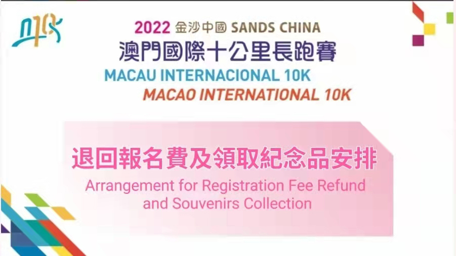 Devido à evolução da epidemia nas regiões vizinhas e em articulação com o trabalho de prevenção e controlo da epidemia, a “2022 Sands China Macau Internacional 10K” organizada pelo Instituto do Desporto e Associação Geral de Atletismo de Macau, e com o título de patrocinador Sands China Limited, foi cancelada. Assim sendo, a Comissão Organizadora anunciou a restituição de taxas de inscrição.