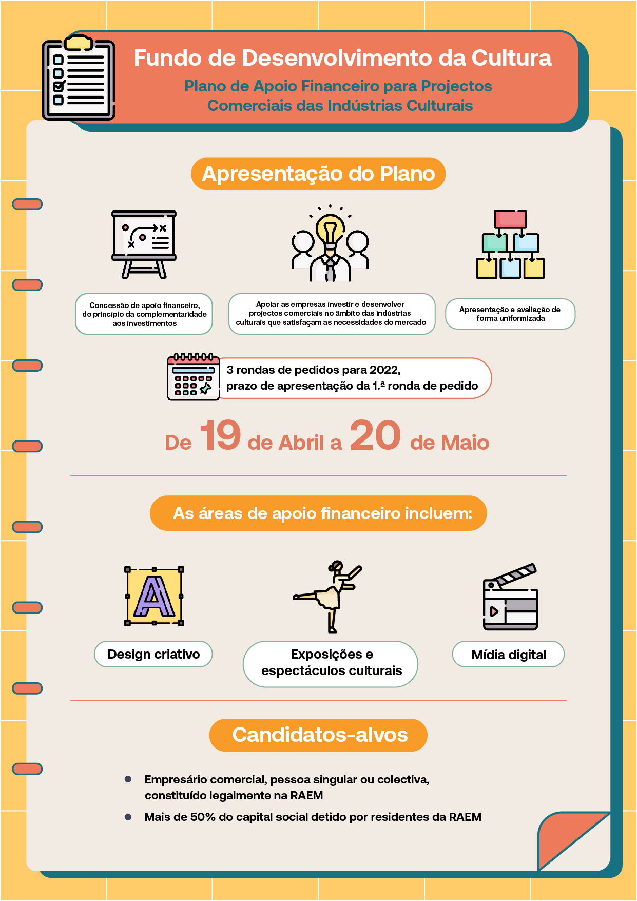 O Fundo de Desenvolvimento da Cultura (FDC) lança o “Plano de apoio financeiro para projectos comerciais das indústrias culturais” (adiante designado por “Plano”), sob a forma de pedidos e avaliação da forma uniformizada. As três rondas de pedidos serão lançadas no corrente ano, nas quais, a 1.ª ronda estará disponível, de 19 de Abril a 20 de Maio, para a apresentação dos projectos candidatos pelos empresários comerciais.