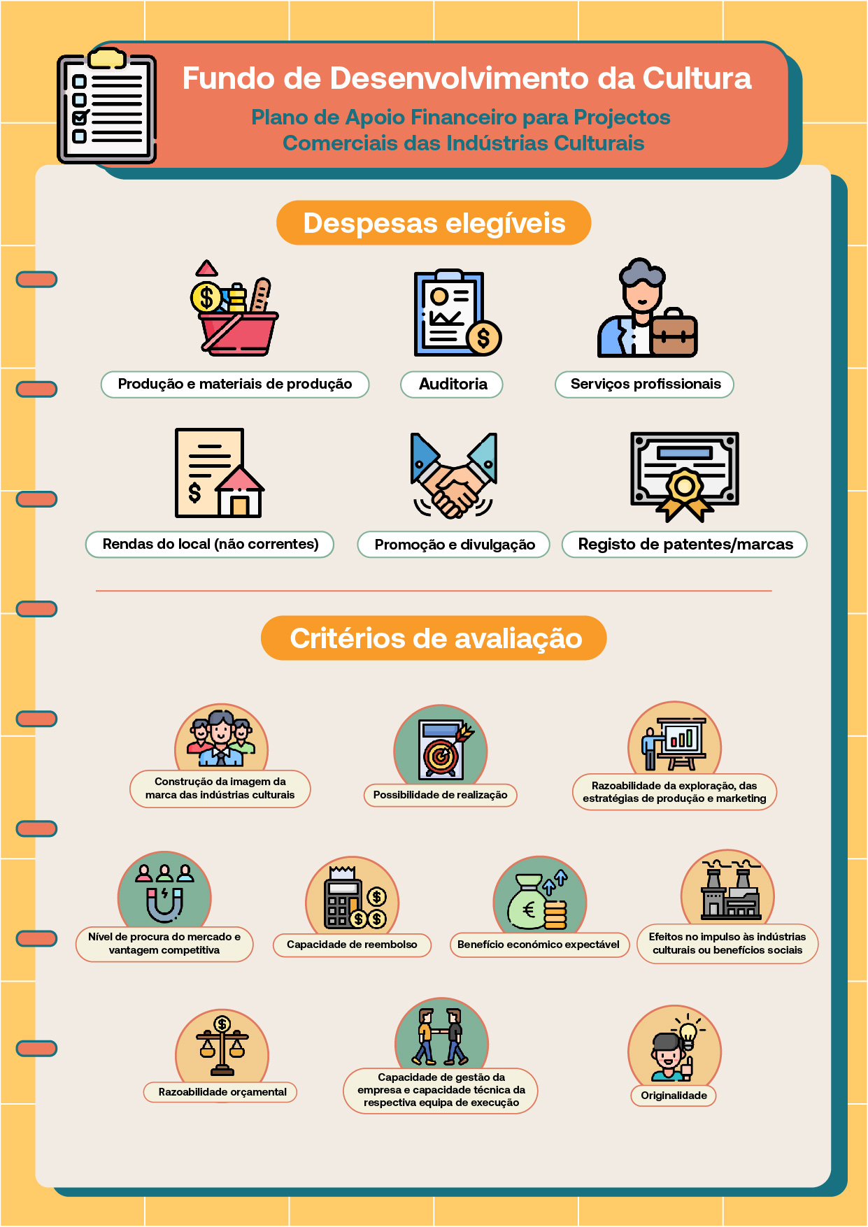 A Comissão de Avaliação de Actividades e Projectos procederá à avaliação dos projectos candidatos, de acordo com os critérios, designadamente, originalidade, possibilidade de realização, razoabilidade da exploração, das estratégias de produção e marketing, nível de procura do mercado e vantagem competitiva, benefício económico expectável, razoabilidade orçamental, impulso ao desenvolvimento das indústrias culturais ou benefícios sociais do projecto, efeitos na construção da imagem da marca das indústrias culturais, bem como, capacidade de gestão da empresa candidata, capacidade técnica da respectiva equipa de execução do projecto, e capacidade de reembolso.