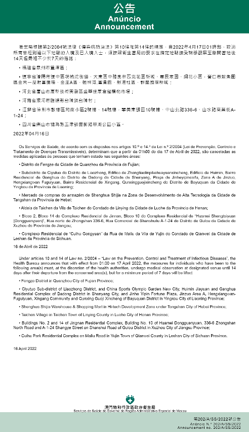 Tendo em consideração a evolução epidemiológica mais actualizada no Interior da China, os Serviços de Saúde, de acordo com os dispostos nos artigos 10.º e 14.º da Lei n.º 2/2004 (Lei de Prevenção, Controlo e Tratamento de Doenças Transmissíveis), determinam que a partir da 01h00 do dia 17 de Abril de 2022, todos os indivíduos que entrem ou já tenham entrado em Macau e tenham estado nos locais abaixo indicados, devem ser sujeitos à observação médica em local a designar, conforme exigências da autoridade de saúde, por um período de 14 dias a contar da data de saída destes locais, não podendo esse período ser inferior a 7 dias: