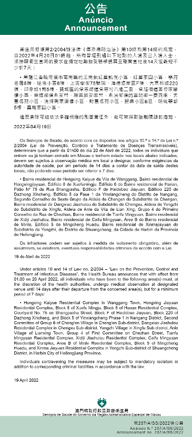 Tendo em consideração a evolução epidemiológica mais actualizada no Interior da China, os Serviços de Saúde, de acordo com os dispostos nos artigos 10.º e 14.º da Lei n.º 2/2004 (Lei de Prevenção, Controlo e Tratamento de Doenças Transmissíveis), determinam que a partir da 01h00 do dia 20 de Abril de 2022, todos os indivíduos que entrem ou já tenham entrado em Macau e tenham estado nos locais abaixo indicados, devem ser sujeitos à observação médica em local a designar, conforme exigências da autoridade de saúde, por um período de 14 dias a contar da data de saída destes locais, não podendo esse período ser inferior a 7 dias: Bairro residencial de Hongxing Kaiyue da Vila de Wanggang, Bairro residencial de Hongxingjiayuan, Edifício 8 de Xuefumingju, Edifício 6 do Bairro residencial de Hanan, Pátio Nº 75 da Rua Shangjiashu, Edifício F de Haidebao Jiayuan, Edifício 220 de Dazhong Xincheng, Edifício 5 da Fase 1 da Yinxiangcheng do Distrito de Nangang, Segundo Conselho do Sexto Grupo da Aldeia de Chengen do Subdistrito de Chengen, Bairro residencial de Dangxiao Jiashulou do Subdistrito de Chengxu, Aldeia de Yongzhi do Subdistrito de Xingfu, Aldeia de Anle da Vila de Lian Xing, Grupo 4 do Primeiro Conselho da Rua de Chezhan, Bairro residencial de Tianfu Mingyuan, Bairro residencial de Xidiji Jiashulou, Bairro residencial de Caifu Mingyuan, Área B do Bairro residencial de Minle, Edifício 5 de Mingcheng Huadu, Bairro residencial de Xinmajiayuan do Subdistrito de Yongzhi, do Distrito de Shuangcheng, da Cidade de Harbin da Província de Heilongjiang.