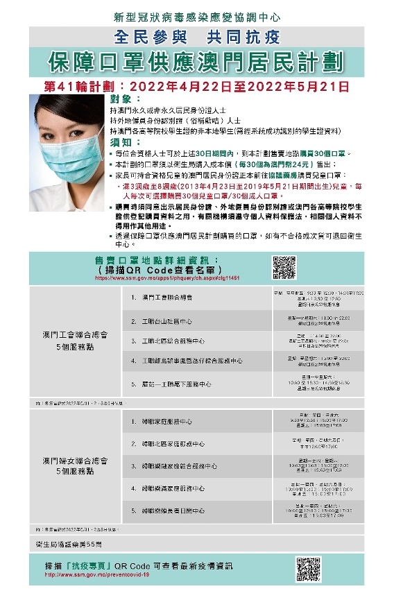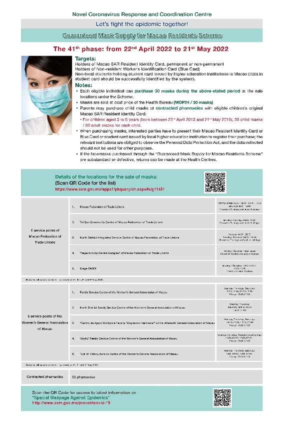 O Centro de Coordenação de Coordenação de Contingência do Novo Tipo de Coronavírus informa que no próximo dia (22 de Abril, sexta-feira), terá início o 41.º Plano de fornecimento de máscaras destinado aos residentes de Macau. O período de venda irá decorrer durante 30 dias, entre 22 de Abril de 2022 e 21 de Maio de 2022. Cada pessoa pode comprar 30 máscaras com um custo de 24 patacas. As máscaras estão disponíveis para venda nas farmácias convencionadas dos Serviços de Saúde e duas associações cívicas (Federação das Associações dos Operários de Macau e Associação Geral das Mulheres de Macau) num total de 65 locais de venda de máscaras em Macau (ver anexo). Os interessados podem consultar a lista em anexo para obter detalhes sobre os pontos de venda e horários de atendimento. As máscaras adquiridas através do “Programa de Fornecimento de Máscaras a Residentes de Macau” podem ser devolvidas aos centros de saúde se estiverem abaixo do padrão ou com defeito. As máscaras adquiridas através do “Programa de Fornecimento de Máscaras a Residentes de Macau” podem ser devolvidas aos centros de saúde se estiverem abaixo do padrão ou com defeito.