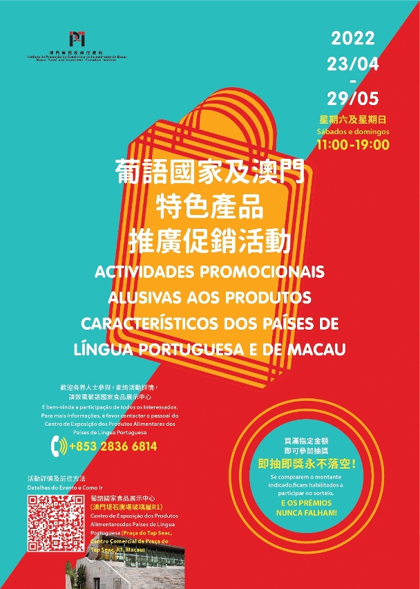 Com o intuito de desempenhar o papel de Macau como Plataforma de Cooperação entre a China e os Países de Língua Portuguesa, promover os produtos vantajosos característicos de Macau e dos Países de Língua Portuguesa, prestando apoio às empresas na procura de parceria, o Instituto de Promoção do Comércio e do Investimento de Macau (doravante designado por “IPIM”) vai realizar as “Actividades promocionais de venda dos produtos característicos dos Países de Língua Portuguesa e de Macau” no centro de Exposição dos Produtos Alimentares dos Países de Língua Portuguesa (também conhecido por “Casa de Vidro”), nos sábados e domingos, entre os dias 23 de Abril e 29 de Maio (das 11h00 a 19h00). Deste modo, o IPIM organizará 13 agentes comerciais de produtos dos países de língua portuguesa em Macau e as empresas titulares de produtos característicos de Macau a participar nessas actividades, para exibir e vender os seus produtos por preços apelativos, pelo que convidamos todos os cidadãos e visitantes profissionais a participarem no evento, incluindo nas bolsas de contacto empresarial.
