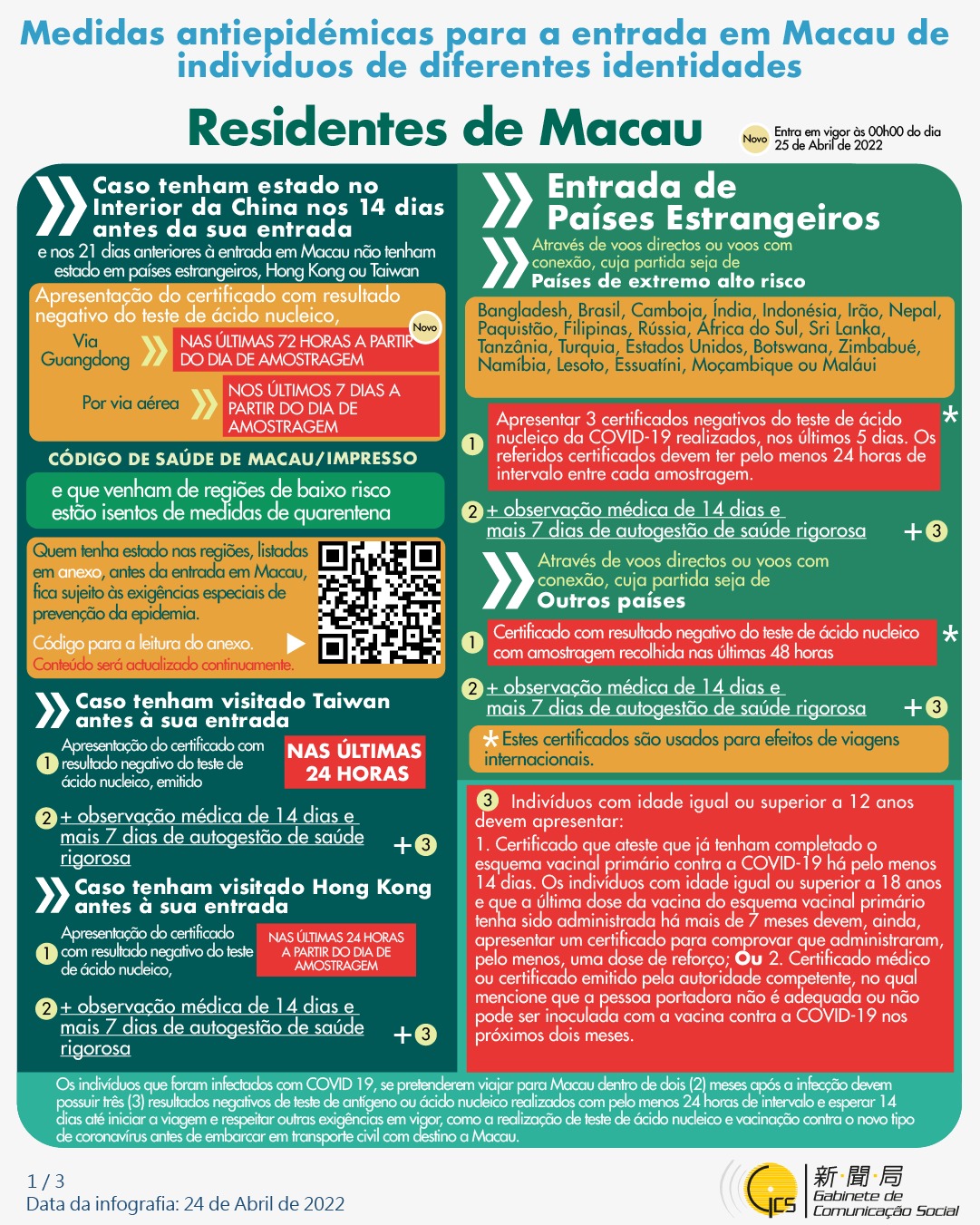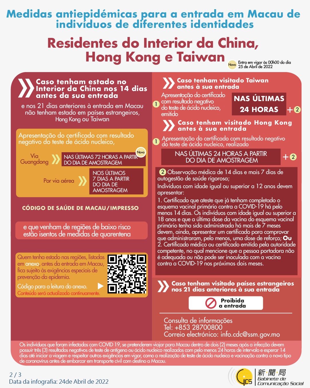 (Infografia)Medidas antiepidémicas para a entrada em Macau de indivíduos de diferentes identidades, actualizadas no dia 24 de Abril de 2022