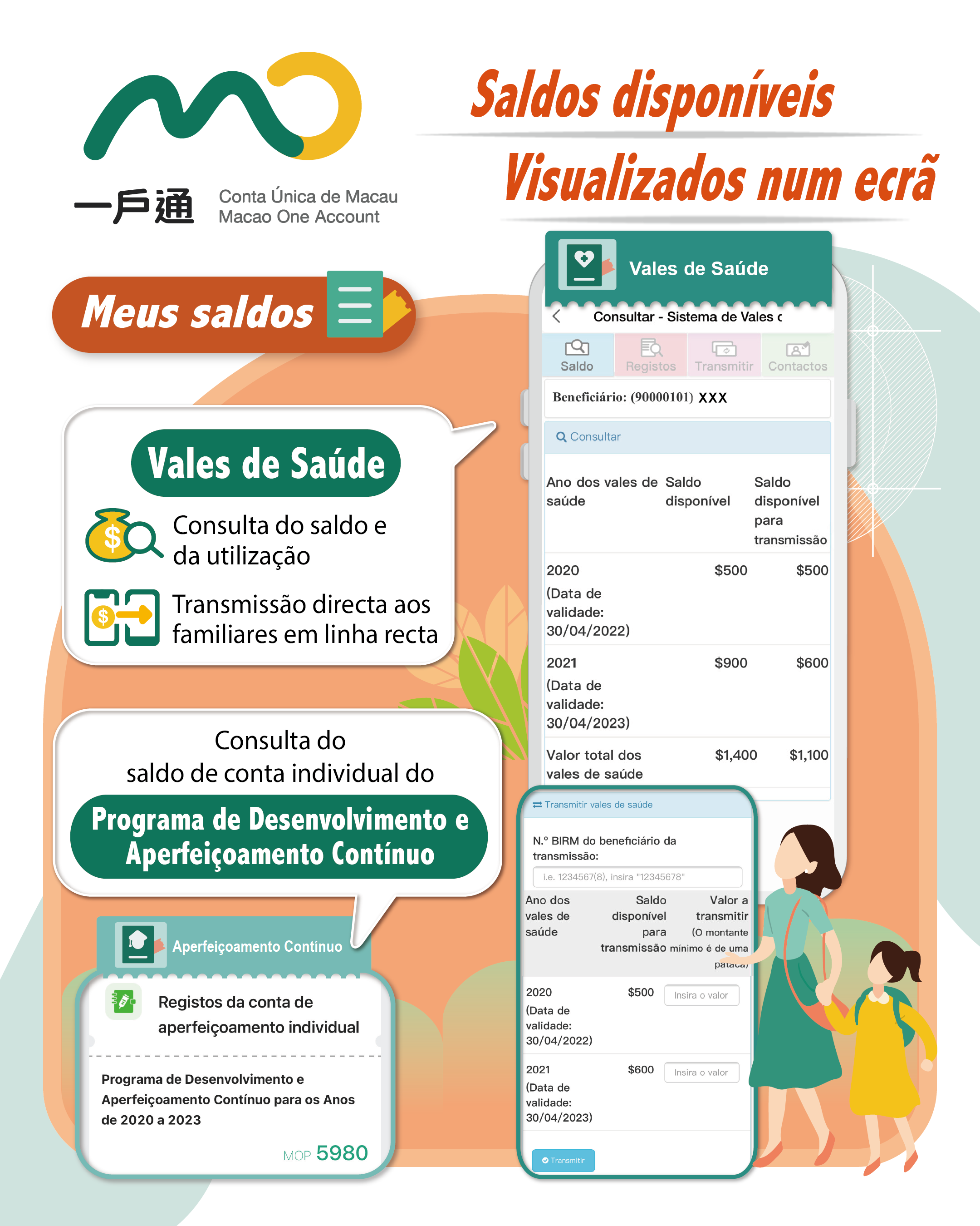 A nova versão da “Conta Única de Macau”, com mais funções, fáceis e convenientes como “Meus saldos”, já foi lançada no dia 11 de Abril. Os residentes podem consultar, para além dos vales de saúde, o saldo e o registo de utilização da conta individual do Programa de Desenvolvimento e Aperfeiçoamento Contínuo, através da “Conta Única de Macau”.
