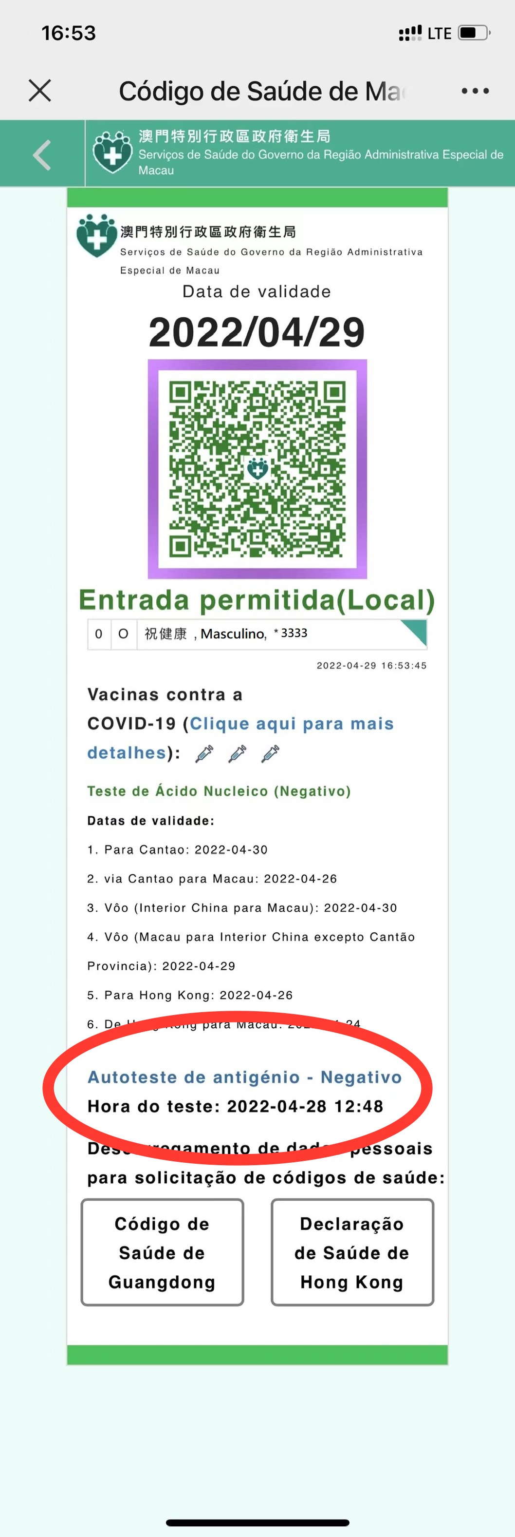 A fim de melhorar e optimizar as funções do “Código de Saúde de Macau”, o mesmo será actualizado às 00h00 de amanhã (dia 30 de Abril) passando a incorporar a exibição do resultado do teste de antigénio (vide imagem 1), e, simultaneamente, será lançada a “Plataforma de declaração do resultado do teste rápido de antigénio para a COVID-19” (vide imagem 2). Além disso, para reduzir o espaço ocupado pelas informações desnecessárias na página principal, o conteúdo das informações sobre vacinas foi simplificado e o gráfico do escudo foi removido passando a ser substituído pela moldura a cores.