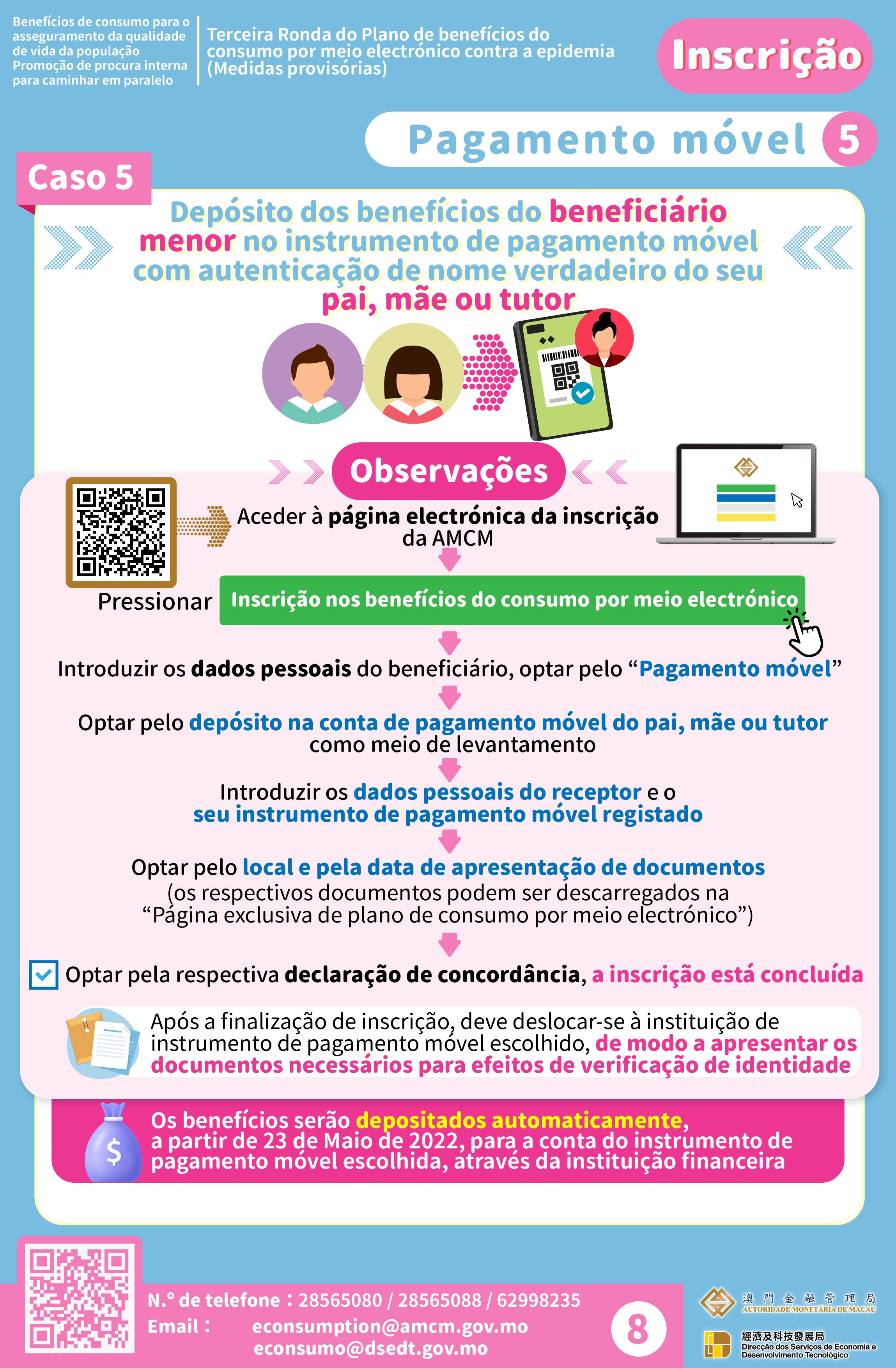 Os benefícios do consumo dos beneficiários menores podem ser transferidos para a conta de pagamento móvel do pai, da mãe ou do tutor. Aliás, nas situações em que os menores que tenham completado 12 anos, caso os mesmos tenham procedido à abertura de uma conta autenticada com o nome verdadeiro, esses podem escolher, na inscrição, a própria conta para a obtenção de benefícios. No entanto, a transferência dos benefícios e a inscrição por conta dos menores estão condicionadas à verificação posterior pelas respectivas instituições financeiras, mediante a apresentação dos documentos como procuração e bilhete de identidade de residente, entre outros.