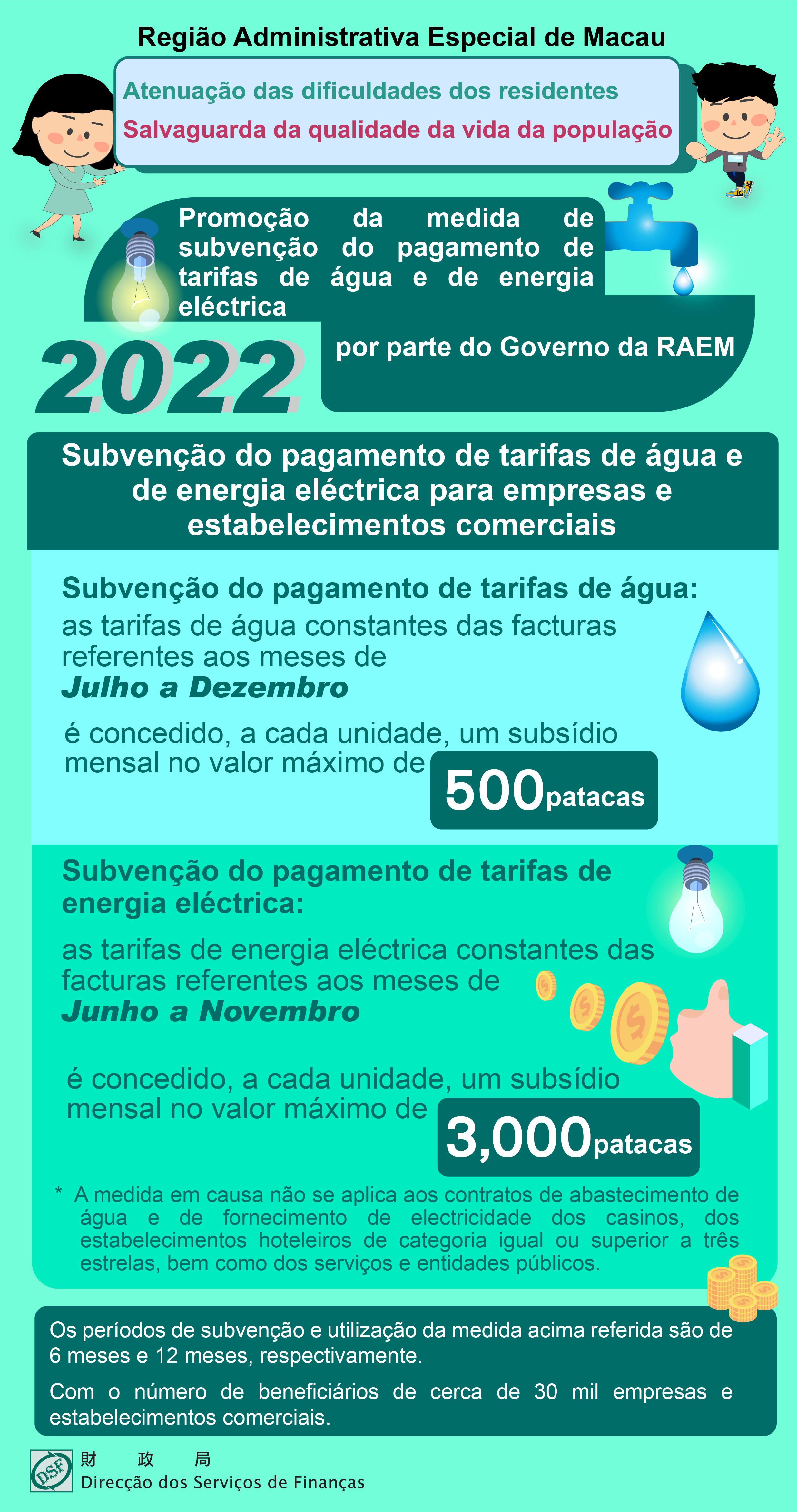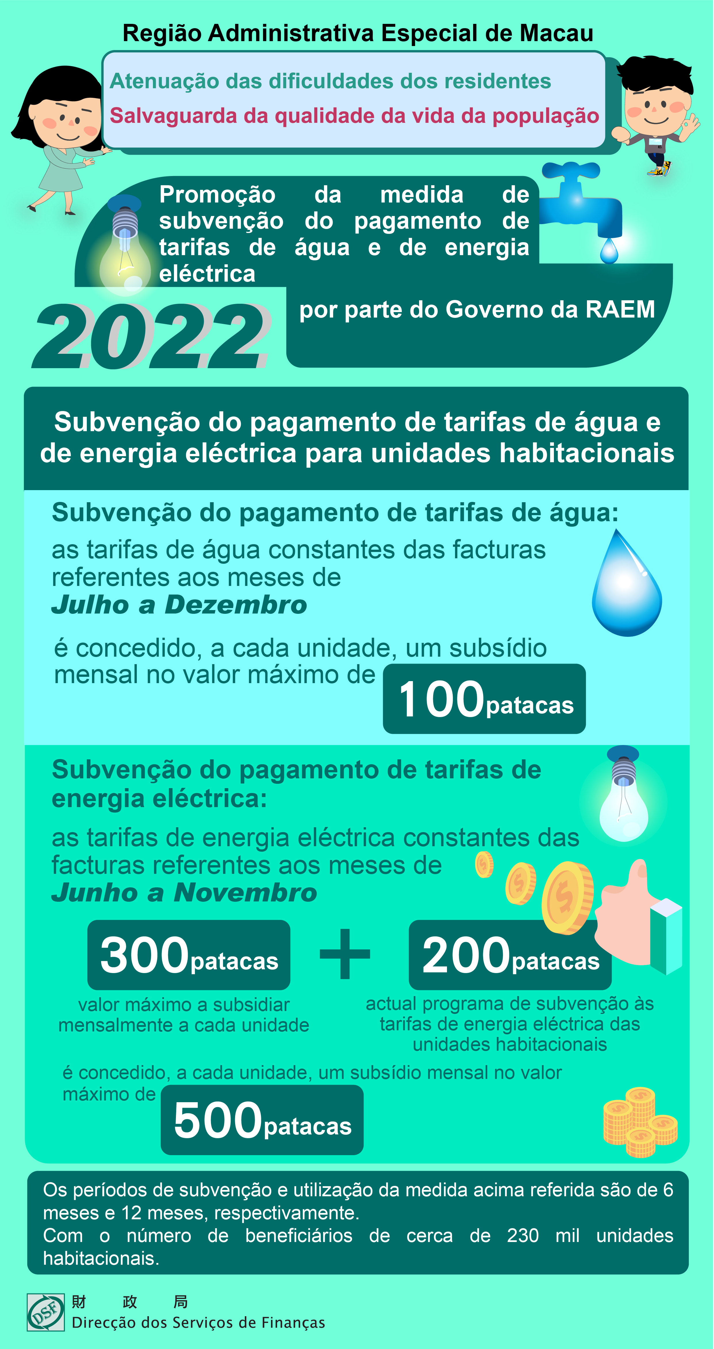 Atendendo ao surto epidémico da pneumonia causada pelo novo tipo de coronavírus, que tem causado impactos na vida da população e na economia de Macau, o Governo da RAEM anunciou previamente a implementação da nova ronda do plano de apoio económico, no sentido de aliviar a pressão de vida dos residentes e reduzir os custos operacionais das pequenas e médias empresas, no qual está abrangida a “medida de subvenção do pagamento de tarifas de água e de energia eléctrica destinada a unidades habitacionais e empresas e estabelecimentos comerciais para o ano de 2022”, com o número previsto de beneficiários de cerca de 230 mil unidades habitacionais e mais de 30 mil unidades não habitacionais, e as despesas orçamentadas de aproximadamente 1,326 mil milhões de patacas.