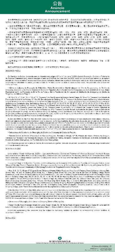 Tendo em consideração a evolução epidemiológica mais actualizada no Interior da China, os Serviços de Saúde, de acordo com os dispostos nos artigos 10.º e 14.º da Lei n.º 2/2004 (Lei de Prevenção, Controlo e Tratamento de Doenças Transmissíveis), determinam que a partir da 01h00 do dia 3 de Maio de 2022, todos os indivíduos que entrem ou já tenham entrado em Macau e tenham estado nos locais abaixo indicados, devem ser sujeitos à observação médica em local a designar, conforme exigências da autoridade de saúde, por um período de 14 dias a contar da data de saída destes locais, não podendo esse período ser inferior a 7 dias: