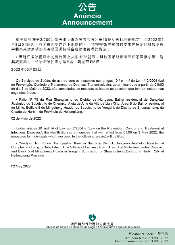 A partir da 01h00 do dia 3 de Maio de 2022, são canceladas as medidas aplicadas aos indivíduos que entrem ou já tenham entrado em Macau mas que tenham saído dos locais abaixo indicados há menos de 14 dias, devem estar atentos ao seu estado de saúde e ser sujeitos a testes de ácido nucleico por iniciativa própria, na ordem temporal de 1.º, 4.º e 7.º dias, o Código de Saúde delesnãoserá convertido para a cor amarela durante esse período: Pátio Nº 75 da Rua Shangjiashu do Distrito de Nangang, Bairro residencial de Dangxiao Jiashulou do Subdistrito de Chengxu, Aleia de Anle da Vila de Lian Xing, Área B do Bairro residencial de Minle, Edifício 5 de Mingcheng Huadu, do Subdistrito de Yongzhi, do Distrito de Shuangcheng, da Cidade de Harbin, da Província de Heilongjiang.