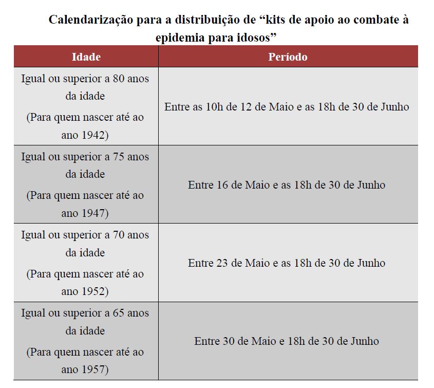 O período para a distribuição de “kits de apoio ao combate à epidemia para idosos” é entre as 10h de 12 de Maio e 18h de 30 de Junho. Para evitar a concentração de pessoas e uma fila longa de espera, a distribuição vai ser efectuada consoante as idades. As pessoas que preencham os requisitos estabelecidos podem receber o “kit de apoio” em qualquer um dos postos de atendimento conforme a calendarização em anexo, mediante exibição do original do seu Bilhete de Identidade de Residente da RAEM, após verificação da sua qualificação. Caso o levantamento seja feito por uma terceira pessoa, o procurador tem de mostrar o original do seu Bilhete de Identidade de Residente da RAEM e do da pessoa em causa.