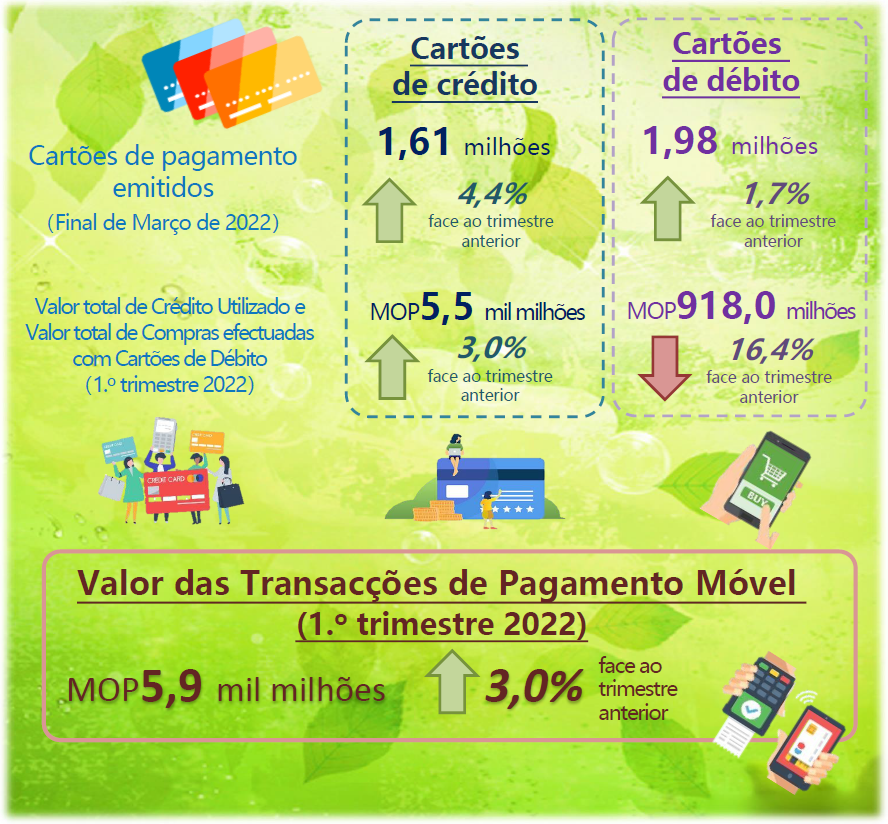 No primeiro trimestre de 2022, o crédito utilizado no período atingiu MOP5,5 mil milhões, o que representou um aumento trimestral de 3,0%. O adiantamento de numerário atingiu MOP164,5 milhões, correspondendo a 3,0% do total do crédito utilizado no período. O número de transacções realizadas com cartões de crédito totalizou 8,8 milhões, o que representou um crescimento trimestral de 9,1%. O montante do reembolso, incluindo os juros e despesas, foi de MOP5,8 mil milhões, o que representou um acréscimo de 7,9% relativamente ao trimestre anterior. Por outro lado, o número de transacções realizadas com cartões de débito (não incluindo o levantamento de numerário) totalizou 425,1 mil, o que representou uma diminuição trimestral de 2,8%. O valor total de compras efectuadas com cartões de débito atingiu MOP918,0 milhões, correspondendo a uma queda de 16,4% relativamente ao trimestre anterior.