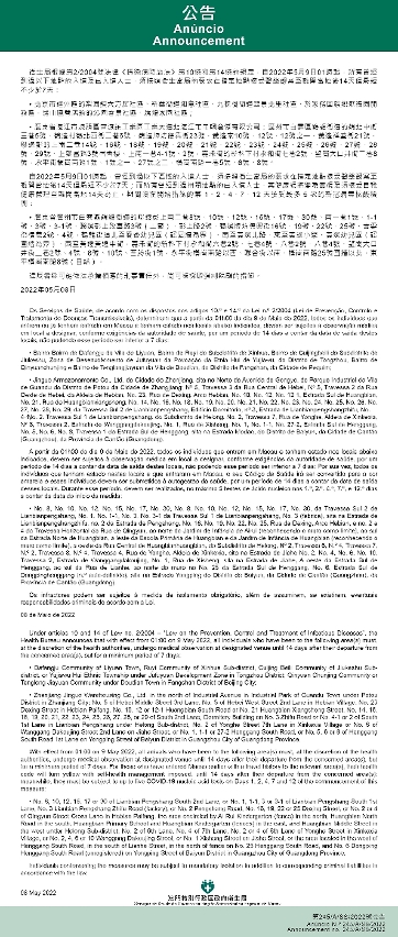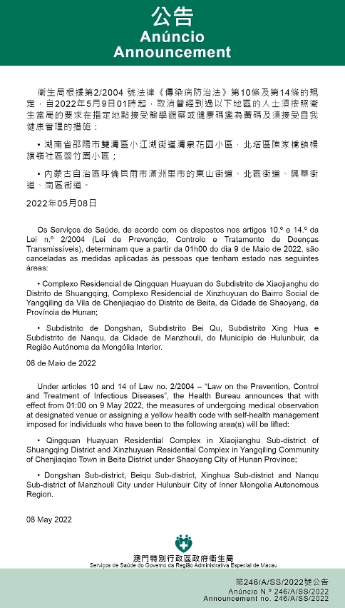 Tendo em consideração a evolução epidemiológica mais actualizada no Interior da China, os Serviços de Saúde, de acordo com os dispostos nos artigos 10.º e 14.º da Lei n.º 2/2004 (Lei de Prevenção, Controlo e Tratamento de Doenças Transmissíveis), determinam que a partir da 01h00 do dia 9 de Maio de 2022, são canceladas as medidas aplicadas às pessoas que tenham estado nas seguintes áreas: