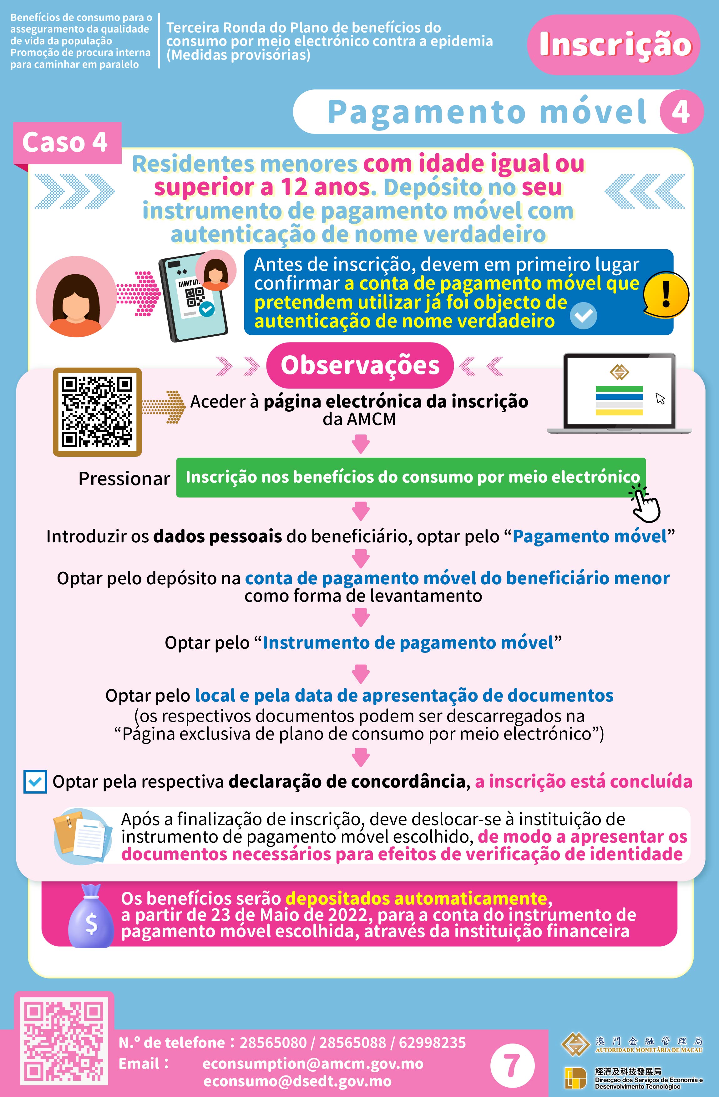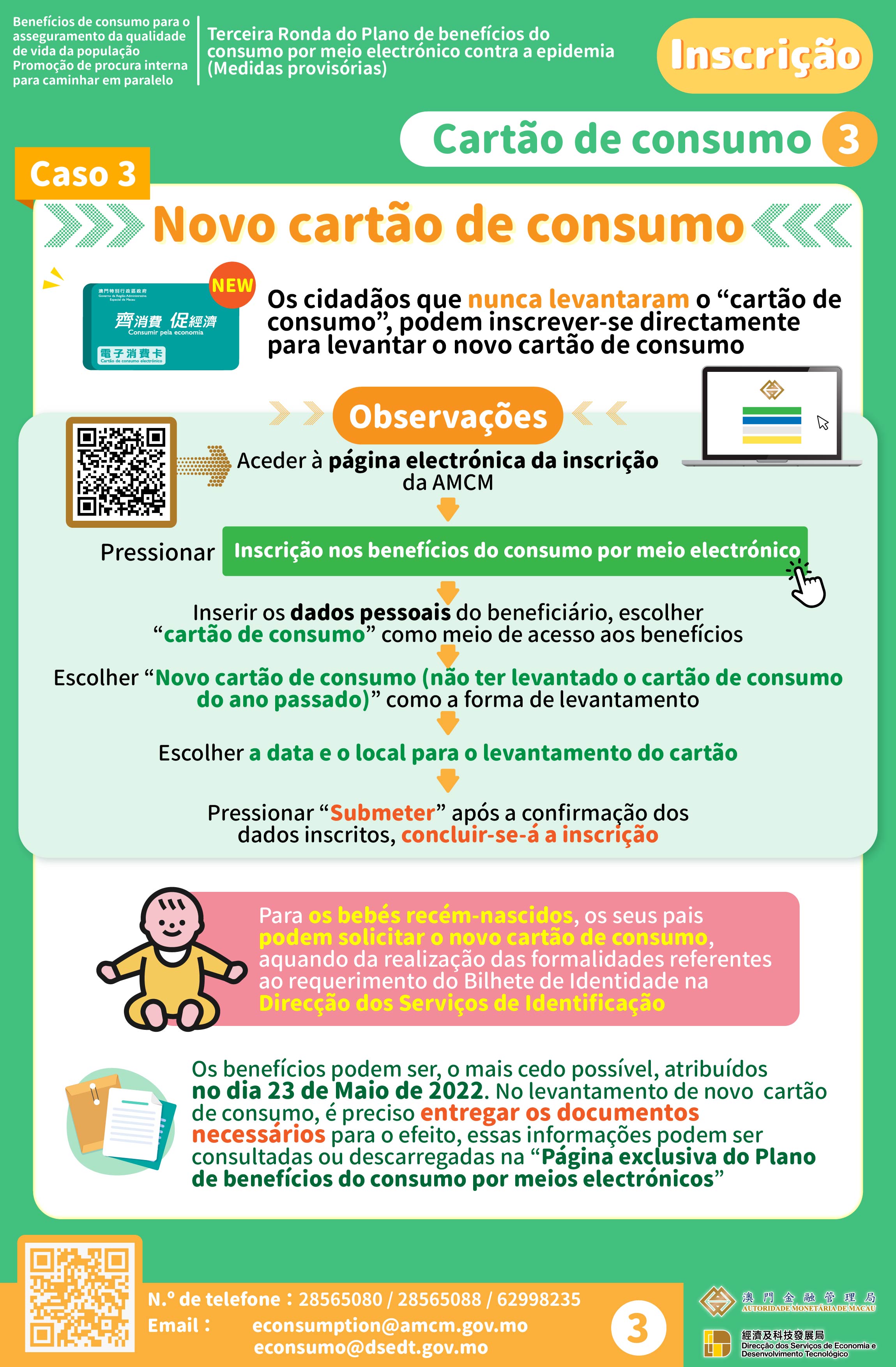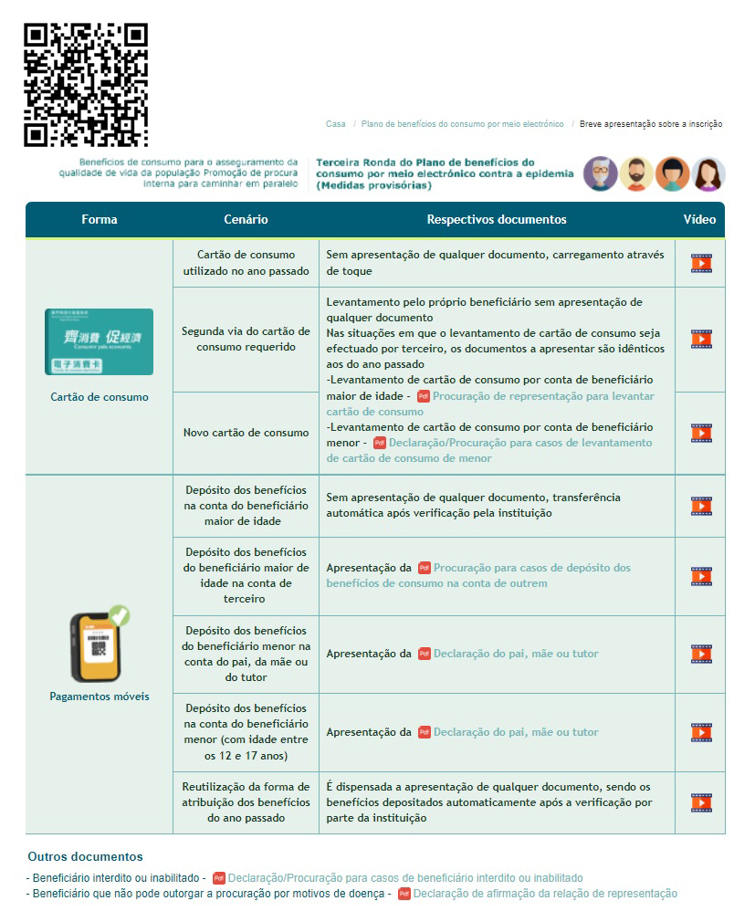 Com vista a facilitar a compreensão por parte da generalidade da população, sobre os procedimentos de inscrição respeitantes a cada uma das formas de levantamento dos benefícios e os documentos exigidos estão disponibilizados os vídeos de apresentação e as respectivas informações na coluna intitulada “Observações da inscrição” da “Página exclusiva” ( https://www.dsedt.gov.mo/econsumo/pt/reg_info.jsp ) e na página electrónica da AMCM ( https://registration.amcm.gov.mo/econsumption/documentchecklist_pt.html ), de modo a facilitar a consulta dos residentes.
