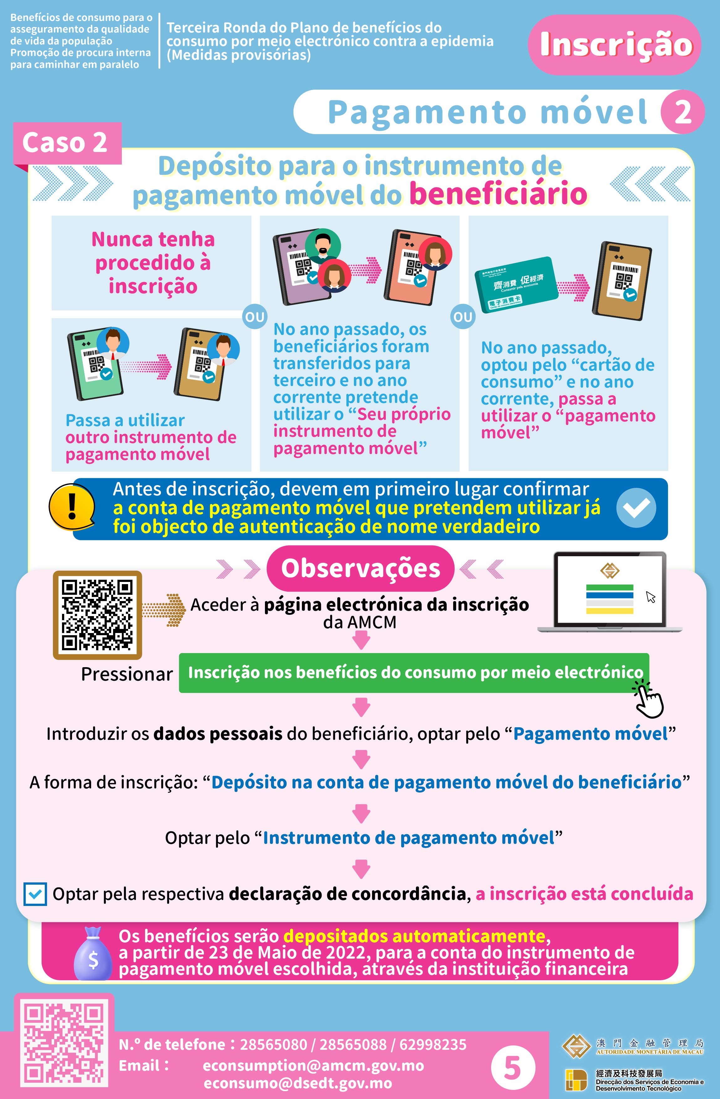 Os residentes podem efectuar a inscrição, a partir das 9:00 horas da manhã do dia 10 de Maio de 2022 até ao dia 13 de Janeiro de 2023, na página electrónica da AMCM ( https://registration.amcm.gov.mo/econsumption/terms_pt.html ), de modo a levantar os benefícios, através de uma das seguintes opções: por meio de “pagamento móvel sujeito à autenticação do nome verdadeiro” ou através do “cartão de consumo electrónico”.