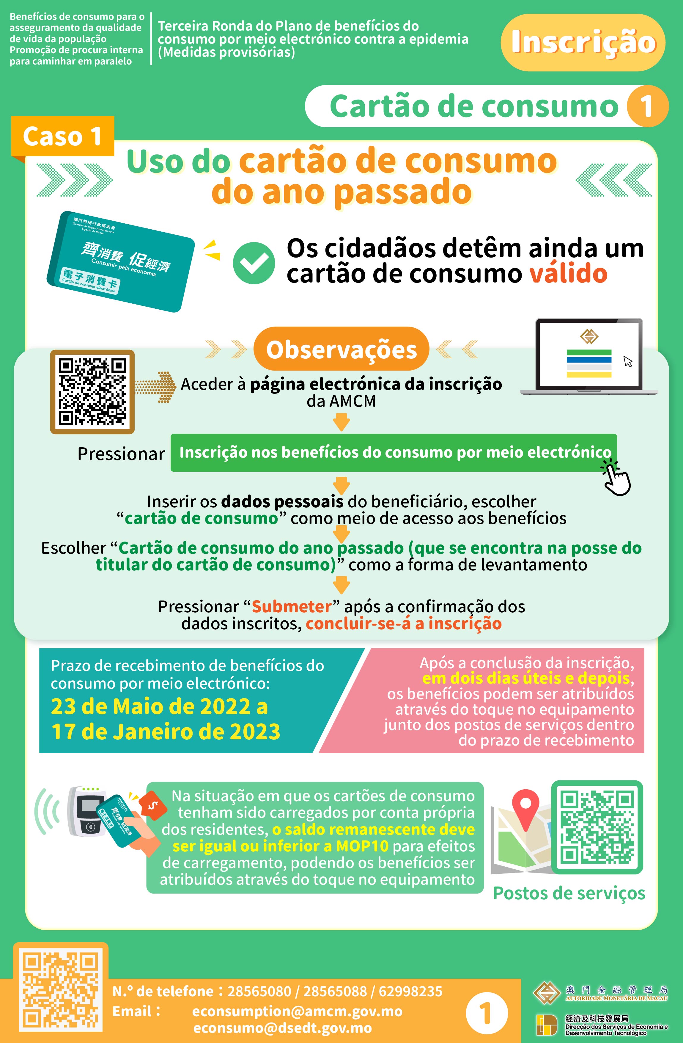 Caso se opte pelo gozo destes benefícios através do cartão de consumo adquirido anteriormente, os residentes podem obtê-los a partir do dia 23 de Maio ou após 2 dias úteis depois da inscrição, sendo que os benefícios de consumo obtidos através do toque no equipamento destinado ao carregamento, junto dos cerca de 170 postos de serviços de carregamento existentes em Macau (Postos de serviços de carregamento: https://www.dsedt.gov.mo/econsumo/pt/topup_loc.jsp ). Para o efeito, o saldo remanescente desse cartão deve ser igual ou inferior a MOP10.