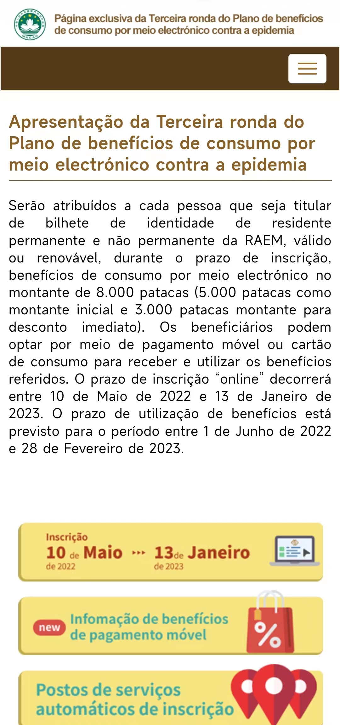 A página exclusiva sobre “benefícios de consumo por meio electrónico” ( https://www.dsedt.gov.mo/econsumo/pt/index.jsp ) já foi melhorada nas suas bases anteriores, dispondo, agora, de informações abundantes e claras, já agrupados conforme os conteúdos. Os conteúdos na referida página incluem a legislação relacionada, novidades, calendarização, processo de inscrição e de levantamento de benefícios, descarregamento de impressos, postos de serviços automáticos de inscrição, informação de benefícios de pagamento móvel, consulta de informação de cartão de consumo, entre outros.