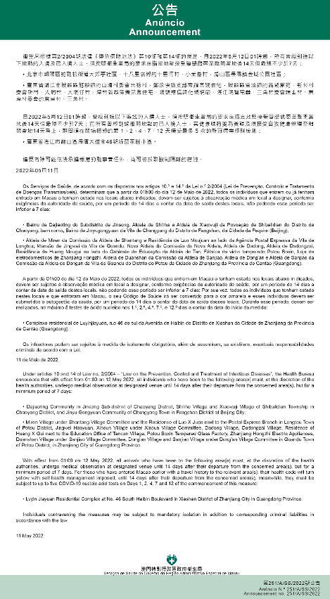 Tendo em consideração a evolução epidemiológica mais actualizada no Interior da China, os Serviços de Saúde, de acordo com os dispostos nos artigos 10.º e 14.º da Lei n.º 2/2004 (Lei de Prevenção, Controlo e Tratamento de Doenças Transmissíveis), determinam que a partir da 01h00 do dia 12 de Maio de 2022, todos os indivíduos que entrem ou já tenham entrado em Macau e tenham estado nos locais abaixo indicados, devem ser sujeitos à observação médica em local a designar, conforme exigências da autoridade de saúde, por um período de 14 dias a contar da data de saída destes locais, não podendo esse período ser inferior a 7 dias: