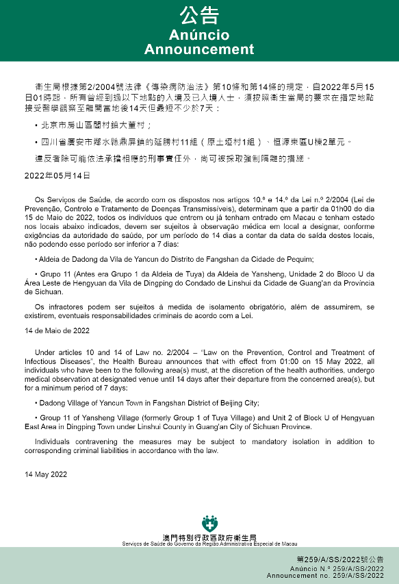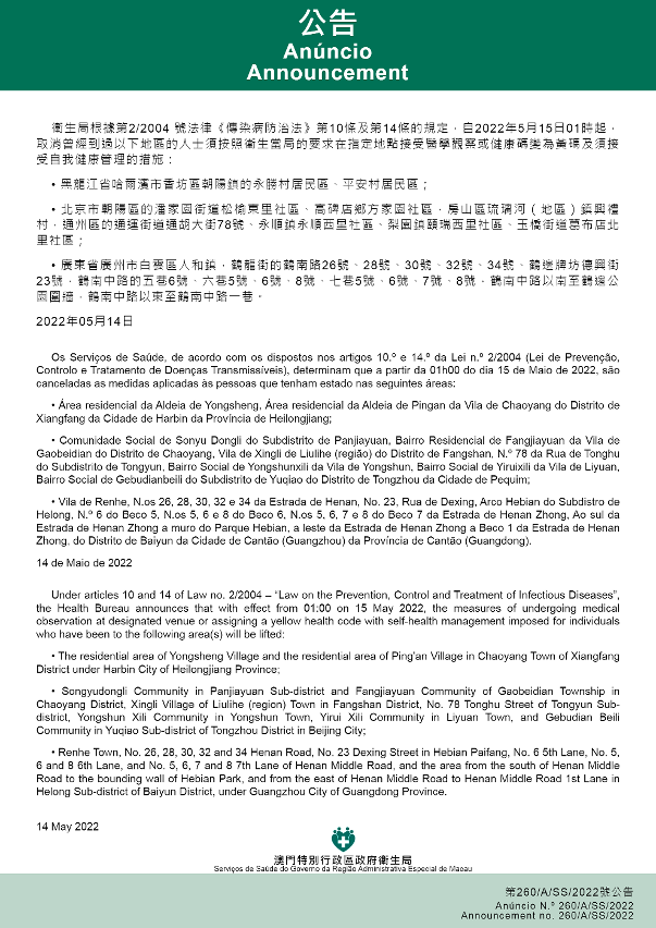 Tendo em consideração a evolução epidemiológica mais actualizada no Interior da China, os Serviços de Saúde, de acordo com os dispostos nos artigos 10.º e 14.º da Lei n.º 2/2004 (Lei de Prevenção, Controlo e Tratamento de Doenças Transmissíveis), determinam que a partir da 01h00 do dia 15 de Maio de 2022, todos os indivíduos que entrem ou já tenham entrado em Macau e tenham estado nos locais abaixo indicados, devem ser sujeitos à observação médica em local a designar, conforme exigências da autoridade de saúde, por um período de 14 dias a contar da data de saída destes locais, não podendo esse período ser inferior a 7 dias: