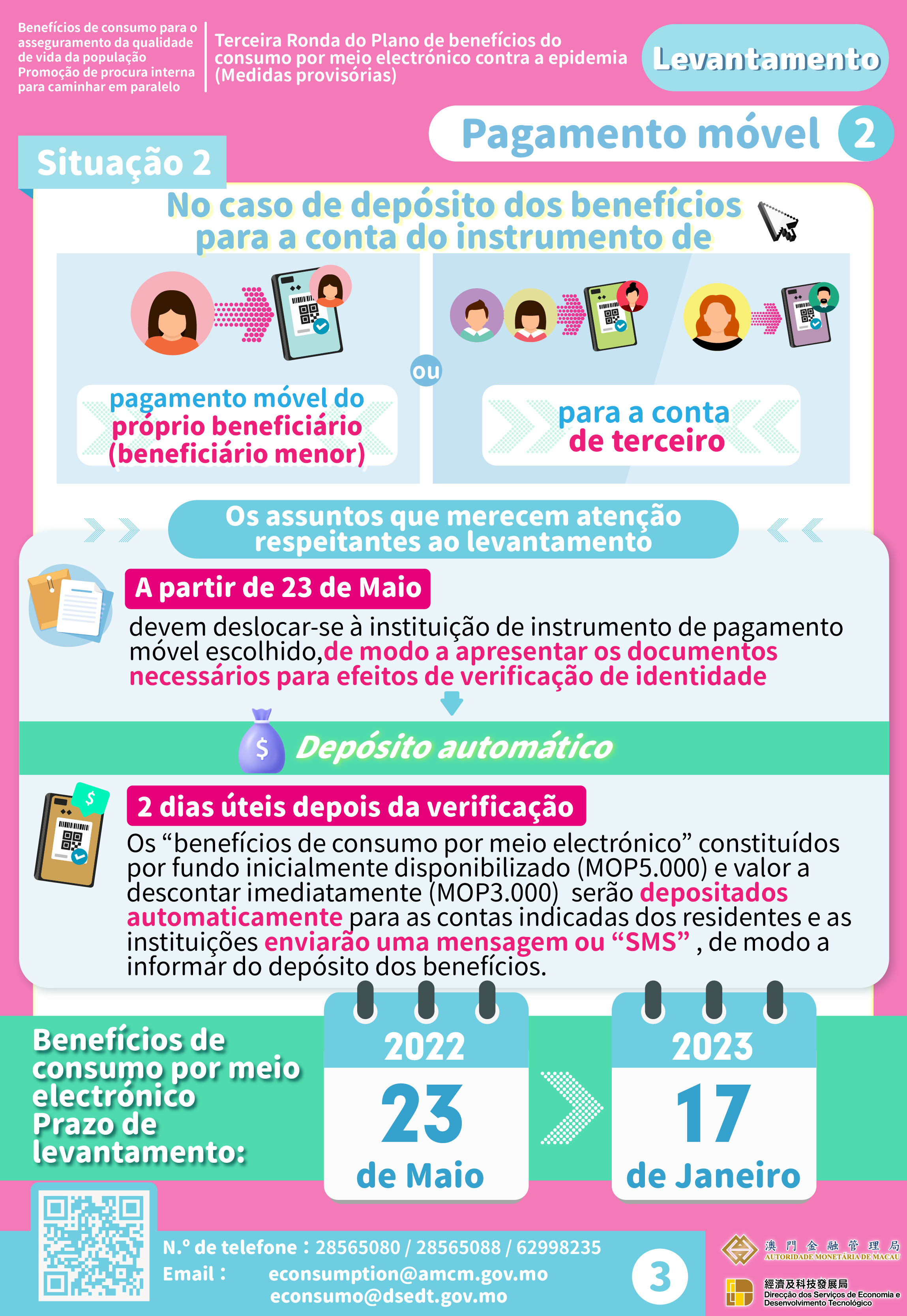 Nos casos em que os residentes tenham concluído até 18 de Maio a inscrição com a opção do instrumento de pagamento móvel do ano passado e os benefícios sejam atribuídos para o seu próprio instrumento de pagamento móvel, ou tenham optado pela “reutilização da forma de levantamento do ano passado” (incluindo os benefícios do próprio residente e os benefícios transferidos), as instituições financeiras depositarão automaticamente, a partir das 09:00 horas de dia 23 de Maio, os “benefícios de consumo por meio electrónico” constituídos por fundo inicialmente disponibilizado (MOP5.000) e valor a descontar imediatamente (MOP3.000) para as contas indicadas dos residentes, enviando uma mensagem ou “SMS” , de modo a informar do depósito dos benefícios.