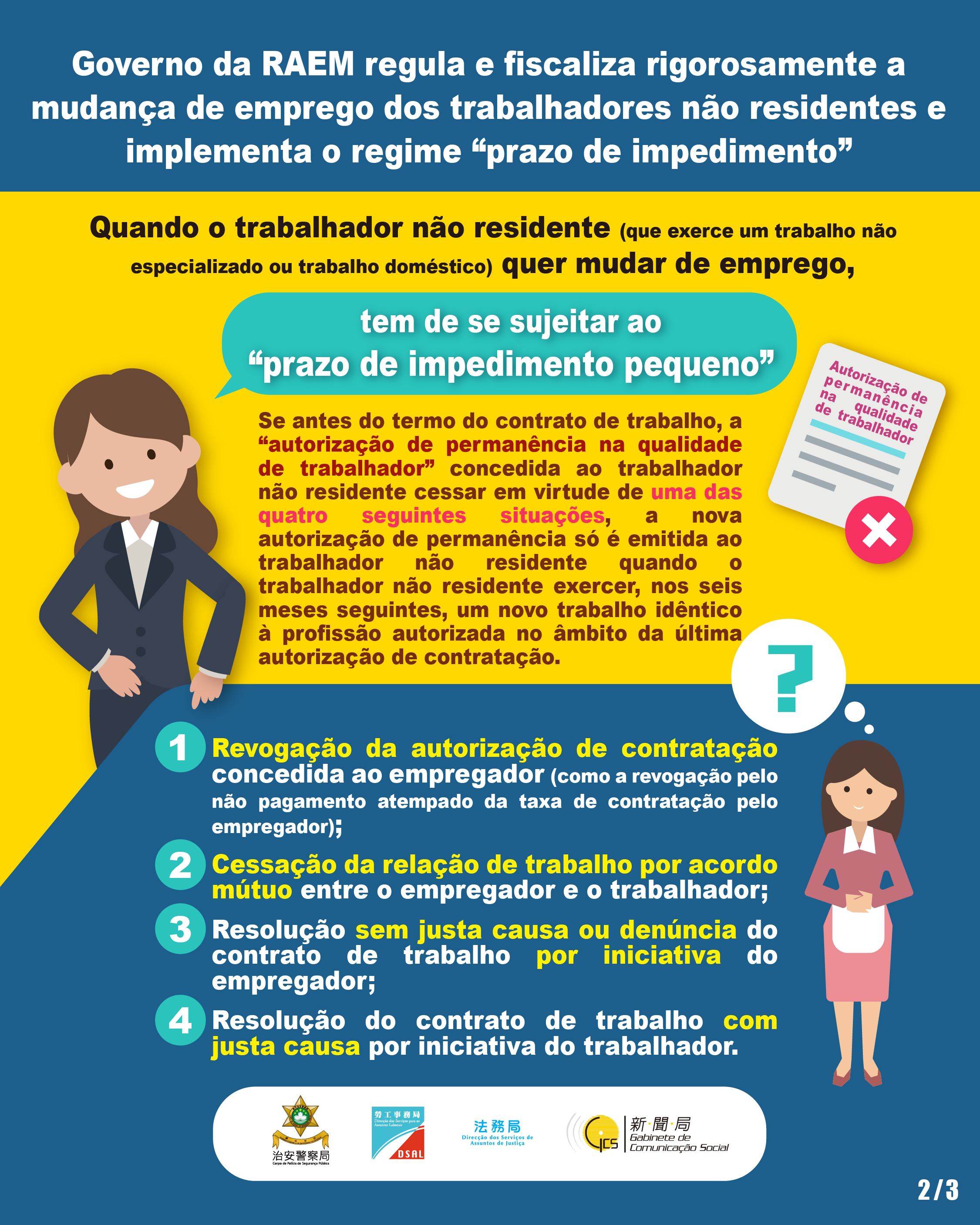 O Governo da RAEM regula e fiscaliza, nos termos da lei, a mudança de emprego dos trabalhadores não residentes, doravante designados por TNRs. Ao abrigo das disposições da vigente Lei da contratação de trabalhadores não residentes, os TNRs podem apenas prestar, em Macau, o serviço ao empregador constante no seu ‘‘título de identificação de trabalhador não residente’’ que é vulgarmente conhecido por “cartão azul” e exercer exclusivamente os trabalhos relativos ao cargo autorizado e constante no “cartão azul”. A lei acima referida dispõe, simultaneamente, do regime “prazo de impedimento” para regular e fiscalizar os fenómenos de os TNRs provocarem propositadamente o seu despedimento e a mudança de emprego.